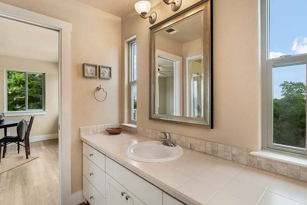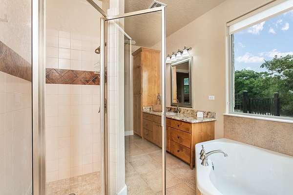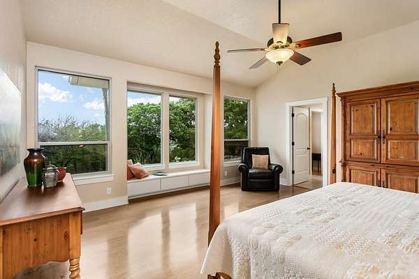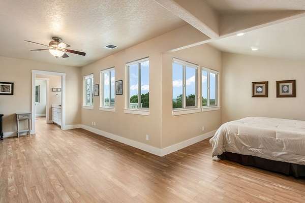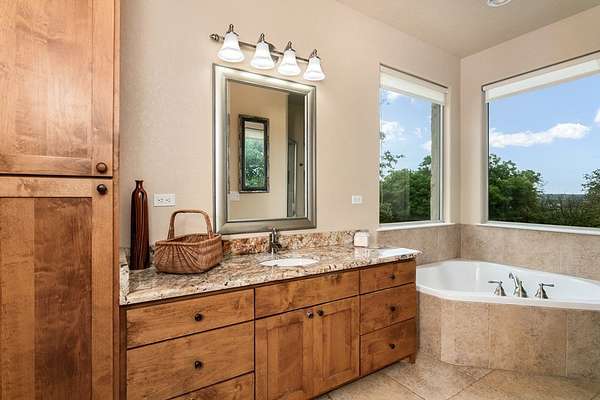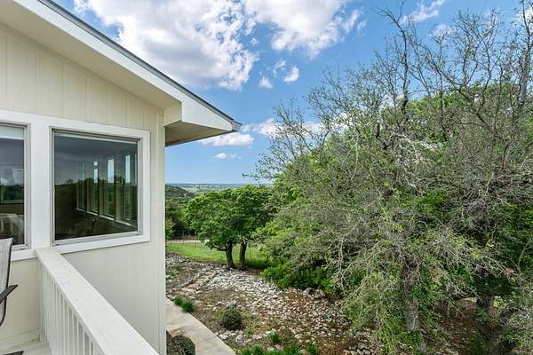 Views for miles and large windows to take it all in! Those are the first things you will notice about this spacioous hill top home just 7 miles from the heart of Fredericksburg's famous Main Street. As soon as you walk in the door you are greeted with Hill Country views all around. The large, open family room is situated to take great advantage of the beautiful, green vistas. The kitchen and dining room are all part of this expansive space. A large primary suite is on this level offering that RARE feature of TWO separate en suite bathrooms, one for each! Each also includes a large walk in closet. Two additional bedrooms are upstairs with a bathroom in between. One is so large with a sitting area and would easily work as a second primary suite. There is an oversized two car garage attached to the home in addition to a barn or workshop space. This 3,294 square foot home was custom built and has only had one owner. The 8.615 acre tract also includes a rainwater collection system, 20 to 30 GPM well and aerobic septic system. The home was beautifully designed with several decks and patios to take in the superior views!