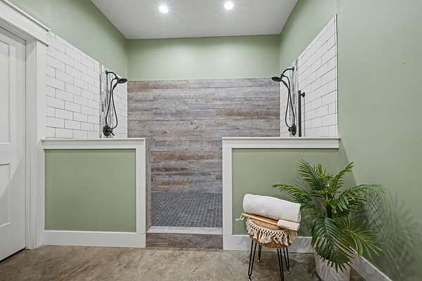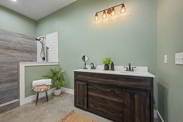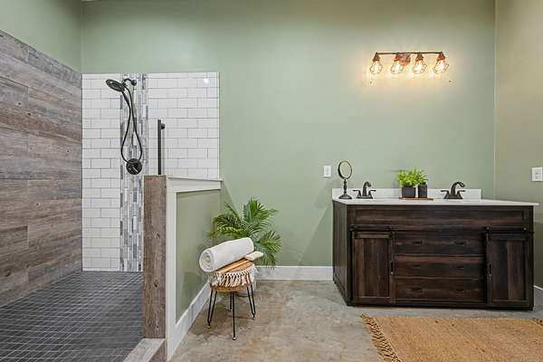The home features tall ceilings, a gas fireplace in the living room, and a large kitchen with abundant cabinetry, center island, pantry, and plenty of storage. The primary suite offers double vanities, a tiled walk-in shower with dual shower heads, and an oversized walk-in closet. All bedrooms include walk-in closets.