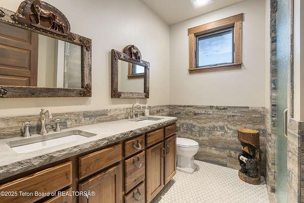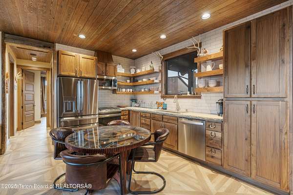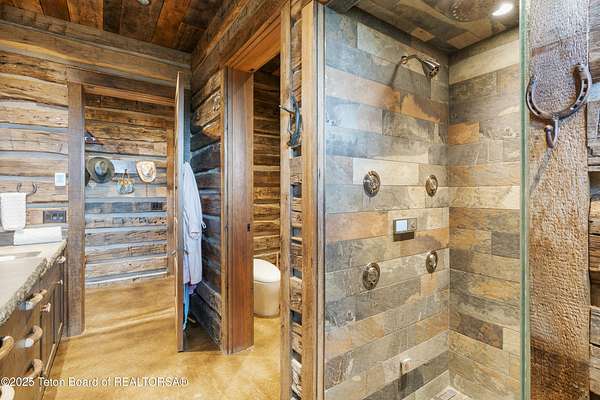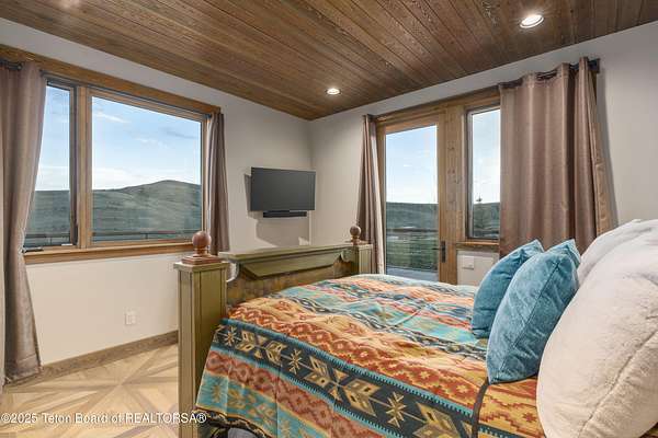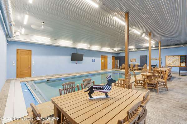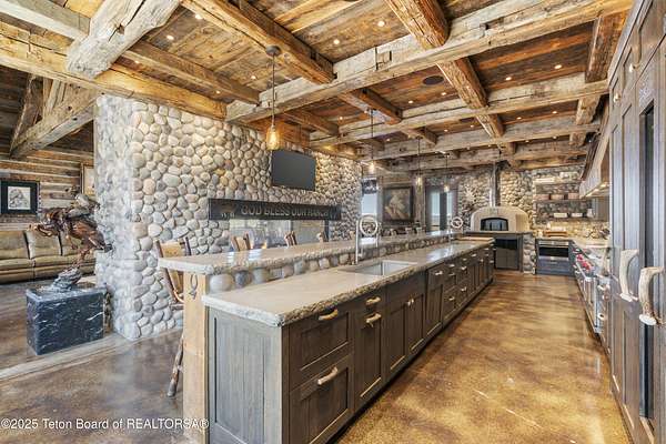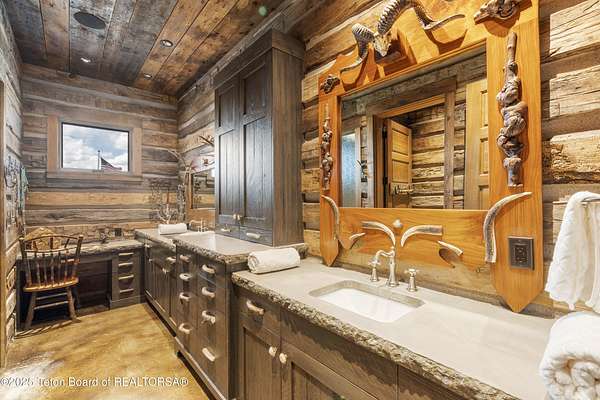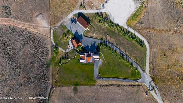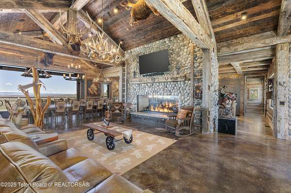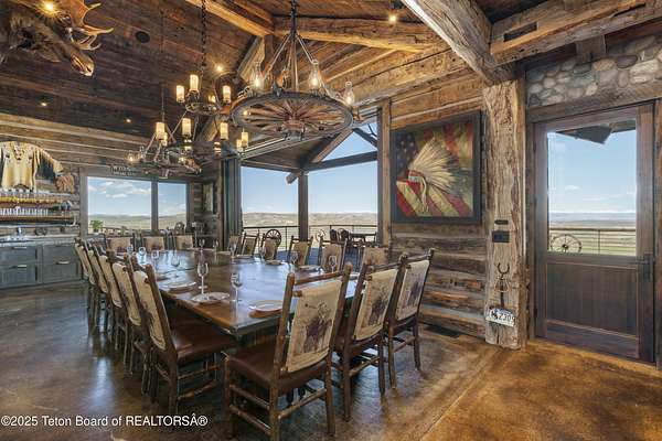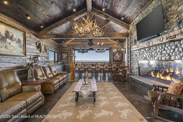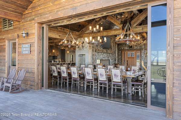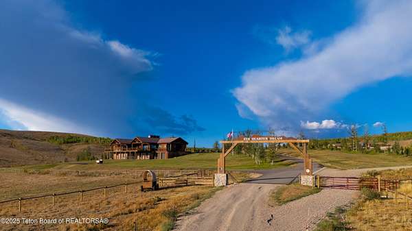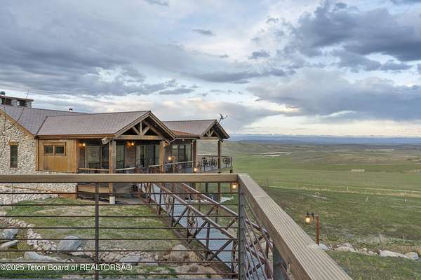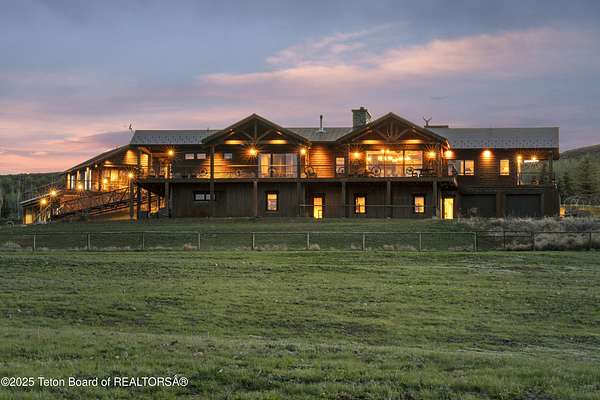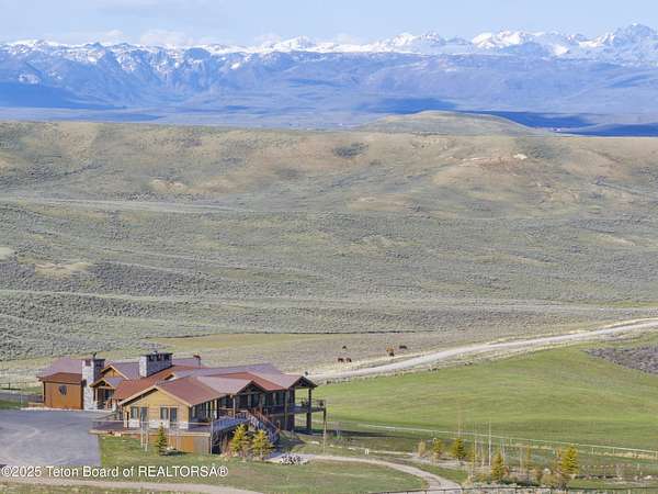 An extraordinary 640-acre Wyoming estate awaits at Solitude Ranch at Aspen Ridge, a meticulously crafted luxury compound that is a rare public land in-holding completely surrounded by BLM public land. This remarkable property captures the essence of authentic Western living with panoramic mountain vistas, three ponds, and direct access to unlimited outdoor recreation. Protected under conservation easement, the ranch ensures permanent privacy while offering versatile living spaces including a custom main residence, detached guest house with indoor pool, and oversized workshop. The thoughtfully designed landscape features comprehensive irrigation systems supporting abundant wildlife ranging from pronghorn to moose. Off-grid features enhance self-reliance with extensive propane systems and comprehensive backup power. This legacy estate presents an unparalleled opportunity to own one of Wyoming's most extraordinary properties. The heart of this home is the expansive open-concept living area, where high ceilings, a majestic custom river rock fireplace, and a wall of glass doors create an ambiance of warmth, sophistication, and natural elegance. Custom beam work crafted with reclaimed timbers adds a touch of rustic charm, while in-floor hydronic heat ensures comfort throughout. This inviting space is perfect for both intimate gatherings and grand entertaining, providing a seamless flow between the main living room, large dining area, and gourmet kitchen. Every room in this home is thoughtfully designed to showcase the awe-inspiring mountain views that surround the property. Expansive oversized glass multi-slide doors seamlessly blend indoor and outdoor living, allowing you to fully immerse yourself in the splendor of nature. The main residence and guest house offer thousands of square feet of outdoor entertaining space comprised of covered and uncovered decks as well as hardscapes and patios. The kitchen is a visual and culinary masterpiece, designed to inspire creativity and cater to the needs of even the most discerning chef. It features top-of-the-line Wolf and SubZero appliances, a full length custom island with ample prep space and bar seating, as well as a commercial-grade Forno Bravo pizza oven for hosting unforgettable events. The adjacent oversized pantry provides additional storage and workspace, ensuring that from entertaining to everyday meals, every culinary need is met. The main level of the home has four complete guest suites, each offering a private sanctuary for family and friends. These well-appointed suites each feature an entrance to the wraparound deck via oversized glass sliding doors, offering peaceful views of the large pond, landscaped stream, and majestic mountains. Inside, each suite features a cozy gas stove for ambiance, as well as thoughtful amenities including a refrigerator, sink, microwave, and floating shelves for accessories. The en-suite bathrooms offer large, luxurious showers, ensuring your guests feel pampered and comfortable throughout their stay. The primary suite offers a serene escape where rustic charm meets modern luxury. Vaulted ceilings adorned with warm, reclaimed timber beams create an airy and inviting atmosphere, while a cozy gas stove adds a touch of warmth and rustic character. The bedroom, bathed in natural light, offers breathtaking mountain views and private access to its own deck area, perfect for savoring morning coffee or evening sunsets. The en-suite bathroom is a spa-like oasis, featuring a custom steam shower with dual showerheads and body sprays, dual sinks, a separate water closet, and a dedicated makeup counter. Completing the suite is a large walk-in closet with custom built-ins, providing ample storage space and ensuring a clutter-free sanctuary. The lower level of the home is designed with family and friends in mind and is accessible by both staircase and elevator. Featuring two separate bunk rooms, the lower level sleeping areas are perfect for accommodating larger