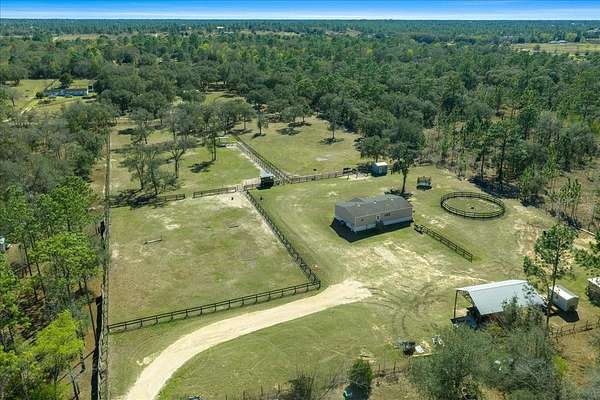 Country living and equestrian convenience come together on this beautiful 5.21 acres, all high & dry and fully fenced. This 4 bedroom, 2 bath home built in 2020 offers 1,560 Sq.Ft. of comfortable living space and is ideally located just 20 miles from World Equestrian Center Ocala, 15 miles from HITS Ocala, and only 5.5 miles from Goethe State Forest with hundreds of riding trails. You will also enjoy being close to stores, dining, and the Gulf. Inside, the home features an open floor plan designed for both everyday living and entertaining. The kitchen offers an abundance of cabinet space along with a large cooking island that overlooks the main living area. The primary bedroom is generously sized and includes an en suite bathroom with double sinks, a tile walk in shower, a garden tub, and a large walk in closet. A split floor plan provides privacy, with three spacious guest bedrooms located on the opposite side of the home. Each guest room includes a walk in closet and easy access to the guest bathroom. Outdoors, the property is thoughtfully arranged for animals and equipment. There are 4 paddocks, one currently used as a 100x200 grass arena, along with a 50ft round pen perfect for training and daily exercise. Two of the fields include run in sheds for shelter. The 22x36 barn can easily be converted into a 3 stall barn or expanded to suit your needs. Approximately 6 dog pens are already in place, making this property ideal for those with multiple dogs, a kennel setup, or working animals. Two additional storage sheds provide space for hay, tack, or equipment. Additional features include a 30 amp RV hookup and dual road access. This property offers the space, setup, and location to enjoy the best of rural living while still being within easy reach of amenities & premier equestrian venues. Call today for your private showing!