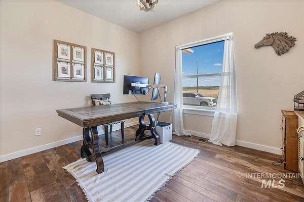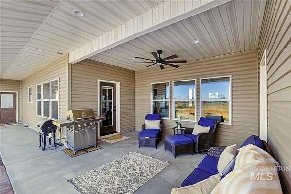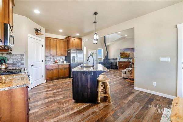 Incredible custom home on 1.54 acres, ideally located between Twin Falls and Jerome. Features top-quality upgrades including natural edge-cut granite throughout, stainless steel appliances, a natural gas oven/stove, large pantry, and a spacious kitchen and laundry/mud room-perfect for big families.The bright, open kitchen and dining area flow into a roomy living space with a cozy Kuma wood stove for cold nights.The primary suite boasts a tray ceiling, large walk-in closet, custom wood-look tile, dual showers, and a soaking tub. Secondary bedrooms are bright, spacious, and inviting.The covered outdoor patio, accessible from the kitchen and primary suite, includes a natural gas line with BBQ, hot tub pad (hot tub negotiable), and brick extension-ideal for entertaining and relaxing by the fire.An oversized three-car garage offers built-in hot and cold water for washing cars or pets and ample storage. The location provides access to over 1,000 acres of BLM land for UTV/ATV enthusiasts and outdoor lovers!