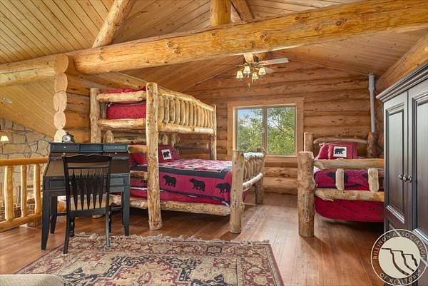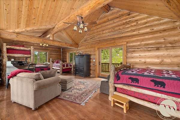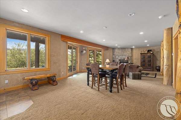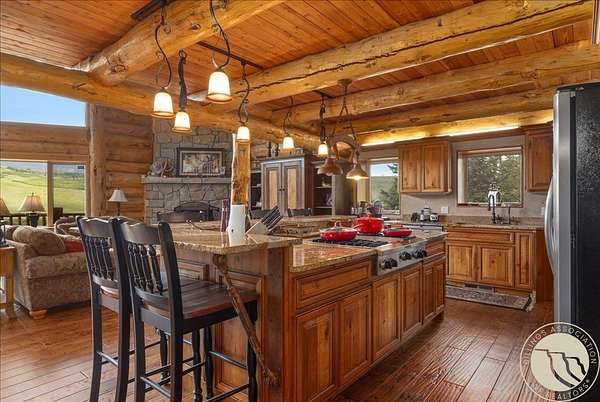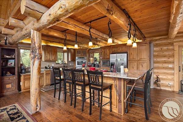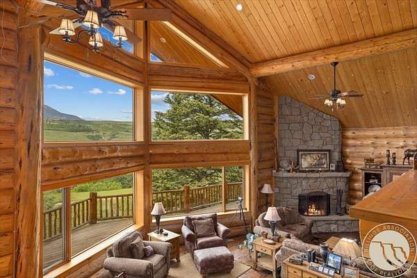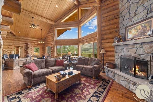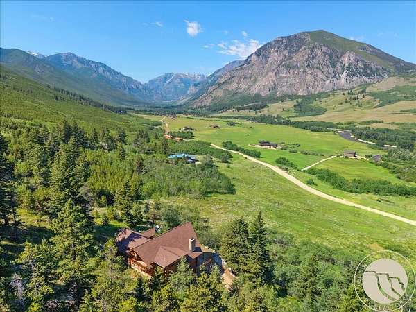 Overlooking soaring peaks and the stunning East Rosebud Valley, this spectacular log home blends rustic charm with modern luxury. Crafted from impressive hand-hewn logs, the home features expansive windows that flood the space with natural light and frame unforgettable mountain views. The great room boasts a striking stone fireplace and warm wood floors. The chef's kitchen offers granite countertops, gas cooktop, double wall ovens, and a huge island perfect for gatherings. The primary suite is a retreat with its own fireplace and spa-like bath with dual vanities and a tiled shower. With 3 bedrooms-including a bunk room that sleeps 8-3.5 baths, and a spacious lower-level family room, there's plenty of room to host and relax. Whether a full-time residence or the ultimate Montana getaway, this one-of-a-kind home is nestled in a breathtaking natural setting that's truly unforgettable.
