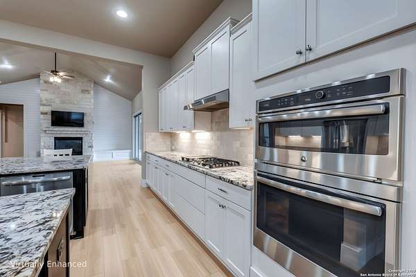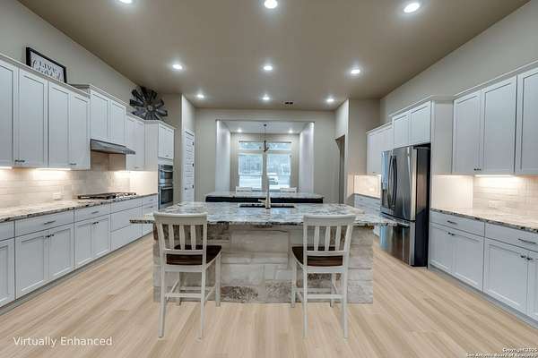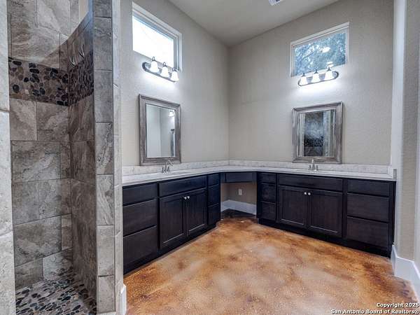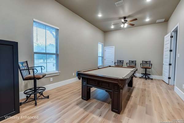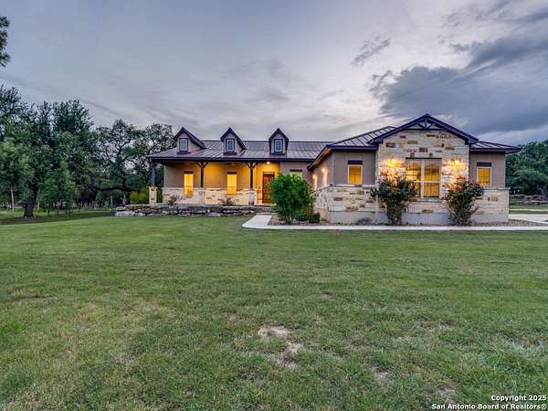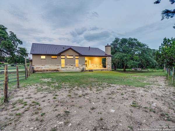 Luxury Hill Country Living on 4.7 Acres with Private Pond & Well. *For visualization purposes, a few images include virtual enhancements to demonstrate potential flooring updates. The seller is offering to negotiate a flooring allowance.* Experience the best of Texas living in this stunning 4-bedroom, 4.5-bath custom home-all en suite bedrooms-in a serene, private setting. Built in 2017, this single-story masterpiece offers 3,229 square feet of thoughtfully designed space with an open floor plan, polished concrete floors throughout, and soaring ceilings that flood the home with natural light. The heart of the home features a spacious living area with a cozy fireplace and an entertainer's dream kitchen-complete with double oversized islands. The refrigerator conveys, and a pool table is also available, making move-in easy and fun. Step outside to enjoy the covered back patio with its own fireplace, perfect for relaxing evenings. Notably, this property includes the only active permitted water well in the neighborhood and an aerobic septic system-rare features that provide both value and self-sufficiency. Additional highlights: Oversized 2-car garage with 8 ft doors. One-owner home with meticulous care Spacious double lot with plenty of room for outdoor living and recreation. Don't miss this exceptional opportunity to own a slice of the Hill Country with modern comfort and piece of hill country land.