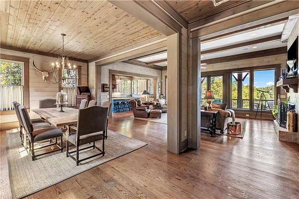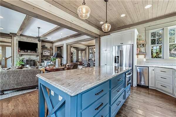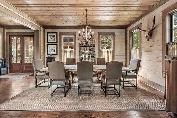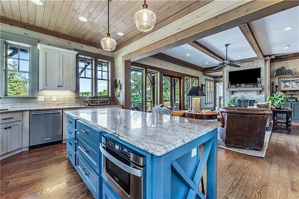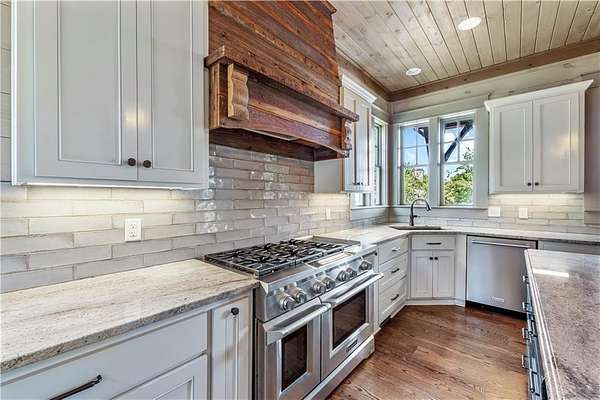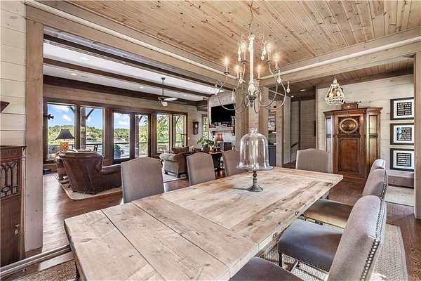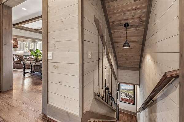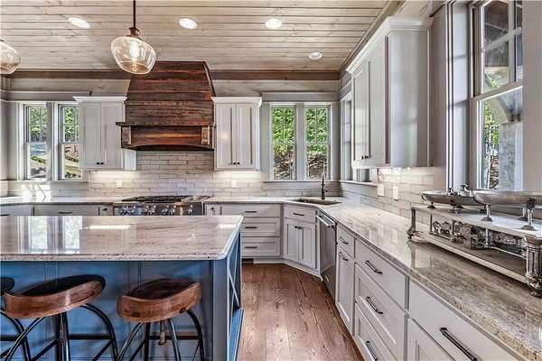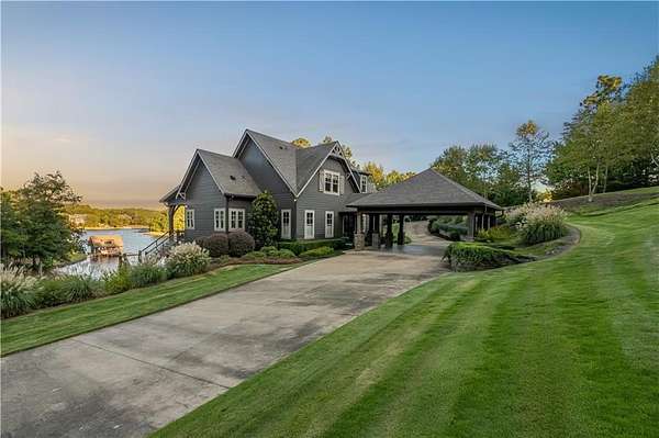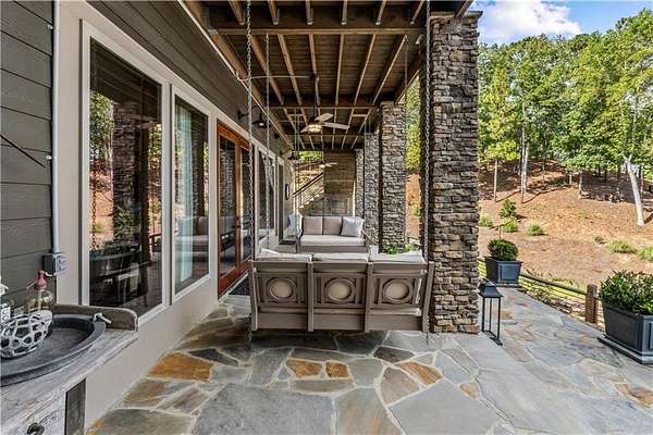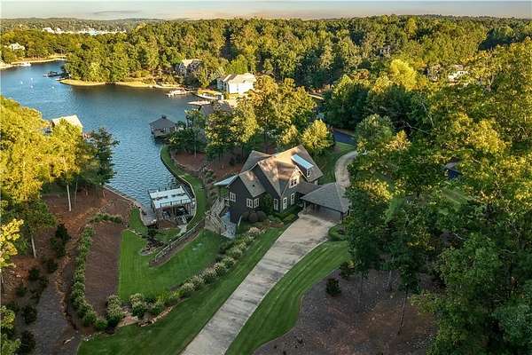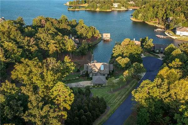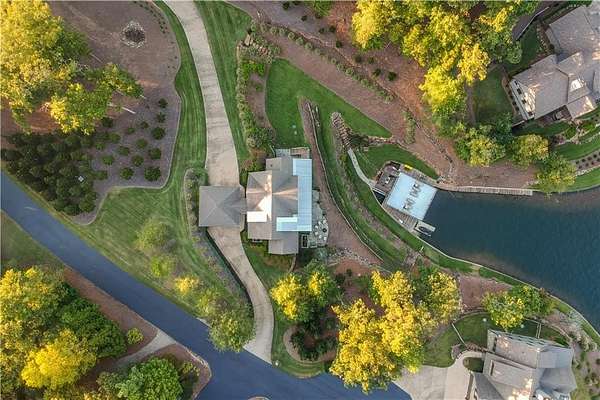 Tucked into 2.7 acres of landscaped splendor 63 Flat Rock Lane is a Lake Martin Sanctuary. This three-level estate balances refined design with an easy, vacation-ready spirit. A chef's dream kitchen-with a grand work island, beautiful granite surfaces and a 48-inch dual-fuel range anchors the main terrace along with the primary bedroom. Each floor invites its own kind of escape ,from lively gatherings to quiet corners for a stolen nap or a sunrise view. Four private bedrooms, plus a fantastic whimsical bunk room makes this home easy to check ALL the boxes. Artful stoned walls, and a deep water slough complete with two covered lifts and an upper sundeck create a lakeside retreat that feels at once sophisticated and playfully indulgent.