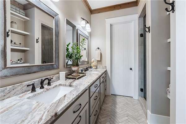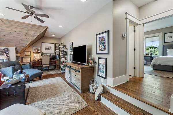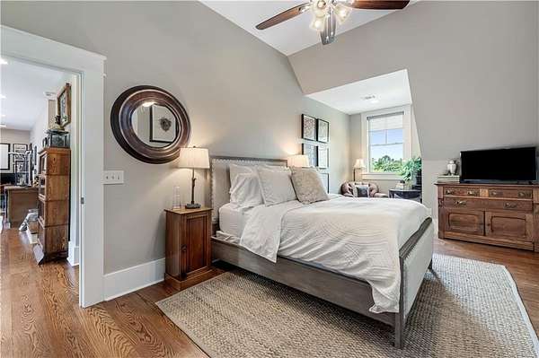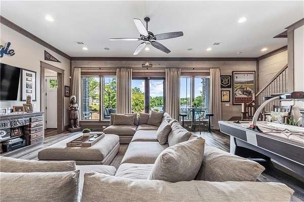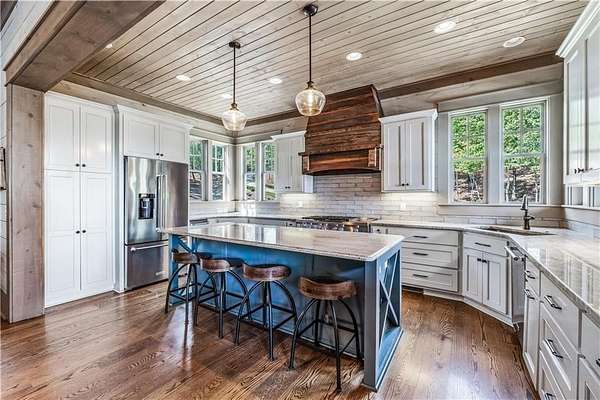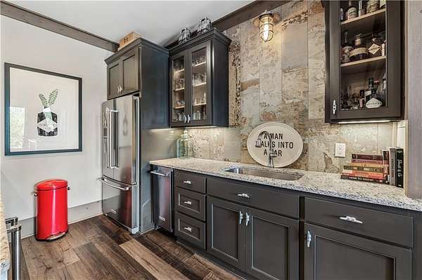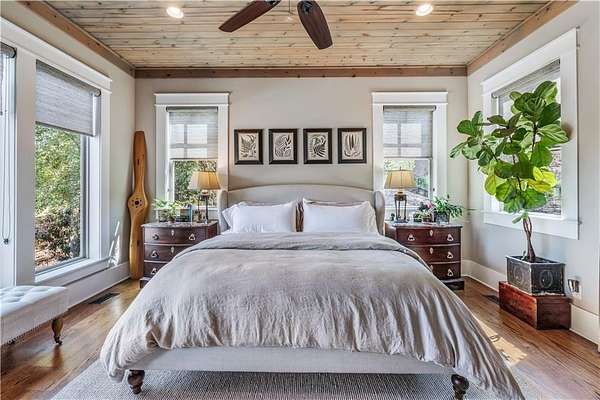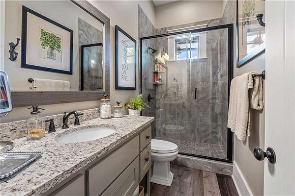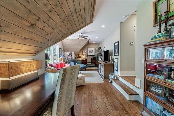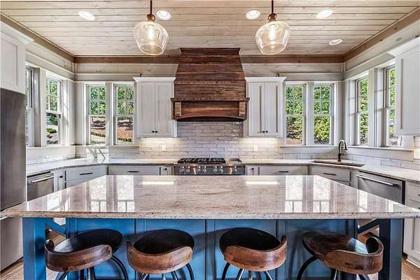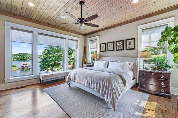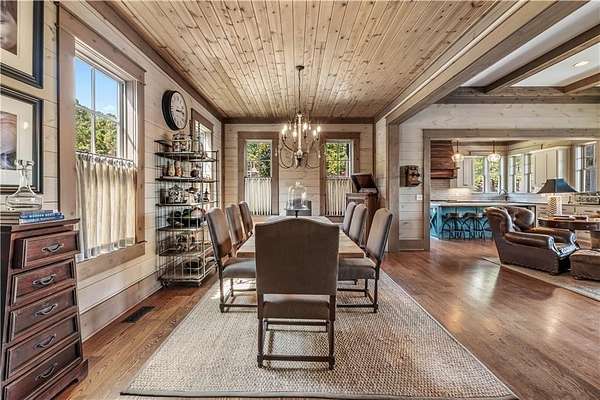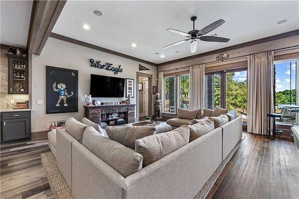 Tucked into 2.7 acres of landscaped splendor 63 Flat Rock Lane is a Lake Martin Sanctuary. This three-level estate balances refined design with an easy, vacation-ready spirit. A chef's dream kitchen-with a grand work island, beautiful granite surfaces and a 48-inch dual-fuel range anchors the main terrace along with the primary bedroom. Each floor invites its own kind of escape ,from lively gatherings to quiet corners for a stolen nap or a sunrise view. Four private bedrooms, plus a fantastic whimsical bunk room makes this home easy to check ALL the boxes. Artful stoned walls, and a deep water slough complete with two covered lifts and an upper sundeck create a lakeside retreat that feels at once sophisticated and playfully indulgent.