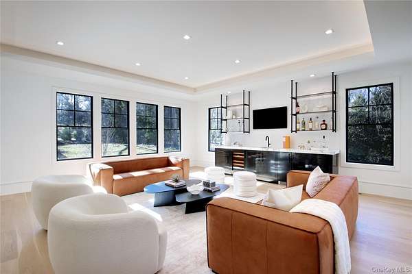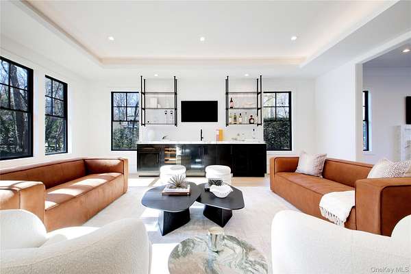 Set on two private acres in the heart of Brookville and located within the Locust Valley School District, 63 Fruitledge Road offers refined luxury living on Long Island's prestigious Gold Coast. This newly completed 6,880 Sq ft residence features a striking modern Colonial exterior with expansive windows and 10-foot ceilings throughout, creating an airy, light-filled atmosphere and large-scale rooms ideal for both everyday living and entertaining. A grand foyer introduces the home's elegant flow. The formal living room includes a fully equipped custom marble wet bar, while the open-concept den is framed by floor-to-ceiling windows overlooking the backyard and anchored by a marble fireplace.The custom kitchen opens seamlessly to the formal dining room and is complimented by thoughtful storage cabinetry, a large center island, Gaggenau gas appliances, double Bosch dishwashers, and a Sub-Zero refrigerator/freezer. Upstairs, all five bedrooms are en suite, offering privacy and comfort for guests alike. The extra-large primary suite serves as a private retreat, featuring dual outfitted custom walk-in closets and a luxurious marble bath with a steam shower, soaking tub, and two vanities. A spacious laundry room is conveniently located on this level. A well-designed service area beyond the kitchen includes a mudroom, a walk-in pantry, a full bath, and convenient access to the three-car garage, back staircase, and steps leading to the basement. The main level also features a generously sized bedroom, ideal for guests or extended stays. Radiant heated floors are featured in all bathrooms and the mudroom. The outdoor space is equally impressive, featuring a heated 40' x 20' Gunite saltwater pool, paver patio, and outdoor kitchen-perfect for entertaining or enjoying the serene, private grounds.