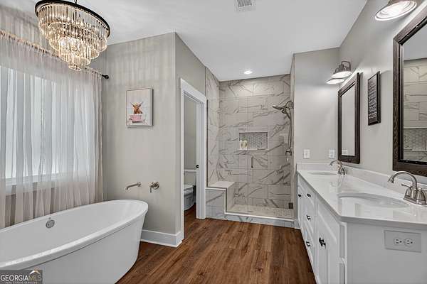 - Double Vanity, Master On Main Level, Separate Shower, Soaking Tub, Tile Bath, Walk-In Closet(s)