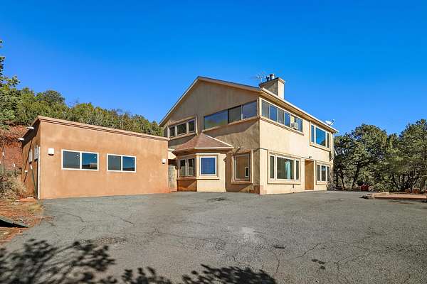 Situated on 4 wooded, peaceful acres, this hilltop home offers sweeping views of mountains, canyons & starry nights with the ultimate sense of privacy. The open floorplan welcomes you with a spacious great room & picture windows that fill the home with light. The kitchen features an island cooktop, pantry, & ample counter space, perfect for everyday living & entertaining. The main floor has two bedrooms, while the upstairs primary retreat is a true getaway with a loft area, a fireplace, full bath with walk-in shower, jet tub, walk in closet, sauna, & bonus workout or office space. The detached casita is ideal for multigenerational living or a separate home office. Solar to offset the utilities. New carpet & wood look vinyl. New septic & well pump installed in '23. Easy access to I-40.