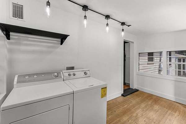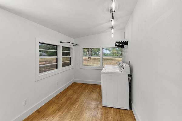 Spacious laundry utility room with abundant storage perfect for pantry goods or canning