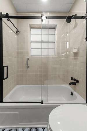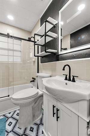 Adorable bathroom with penny tile, smart mirror, and shower-tub combo