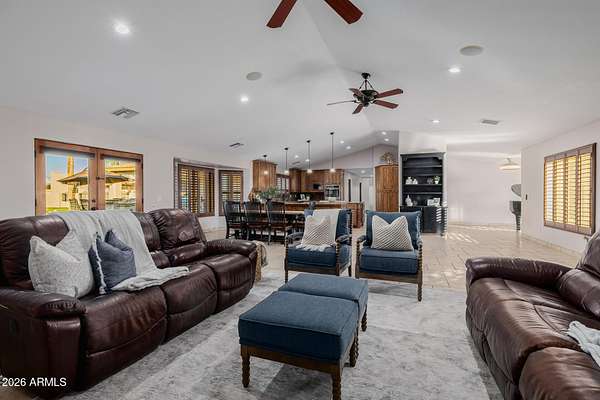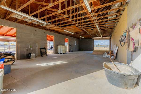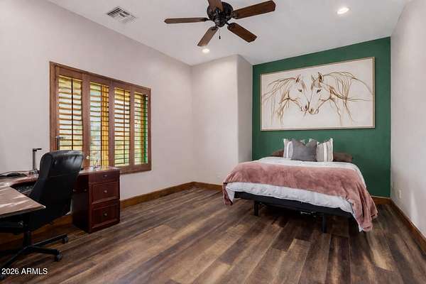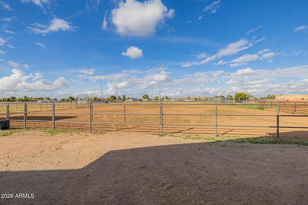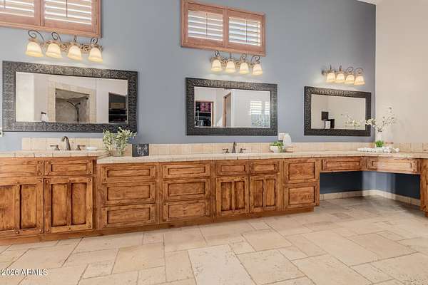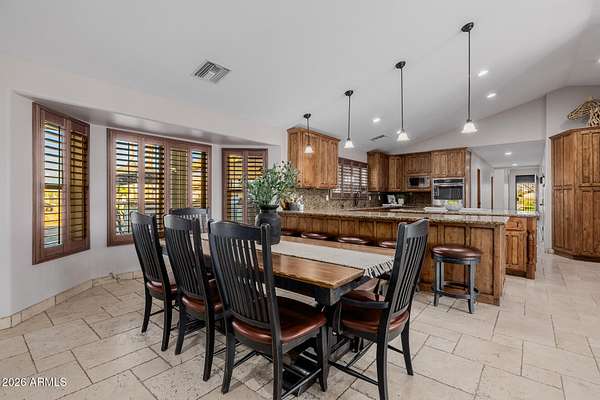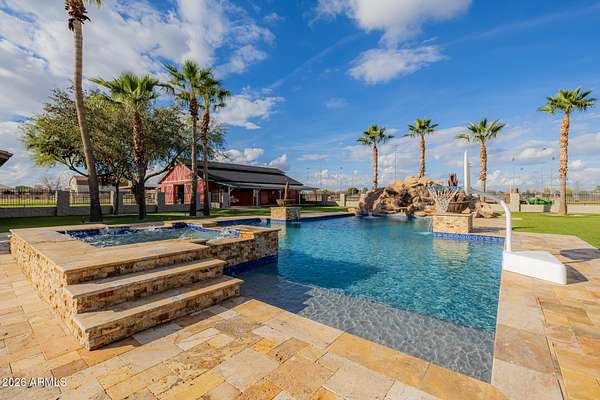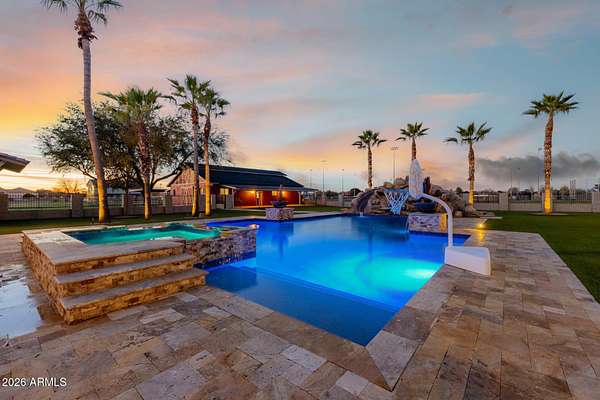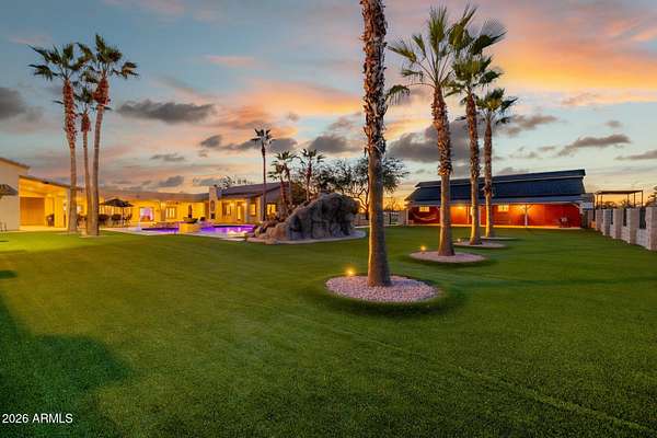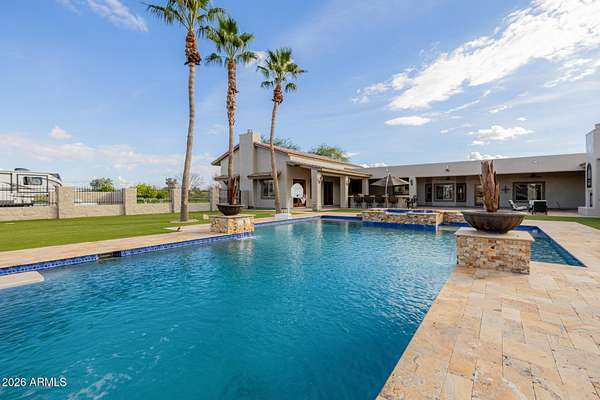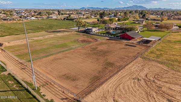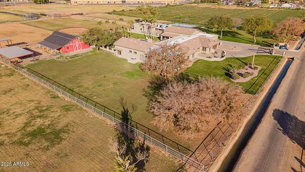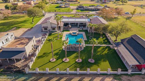 If you've been dreaming of a place where every day feels like a getaway, this exceptional estate delivers. Situated in one of Gilbert's most sought-after areas, this quiet and private property spans nearly 5 irrigated acres, an offering that rarely comes to market. The seller invested extraordinary care into the home, sparing no expense and thoughtfully upgrading every detail throughout. The custom single-level main residence of almost 6,600 sqft. offers 5 beds, 4 beautifully tiled natural stone baths, 2 laundry rooms, plus spacious bonus room that could easily function as a 6th bedroom with exterior access. Guest house! One of the home's most impressive features is the expansive 1,250 sqft. game room, showcasing vaulted wood-beam ceilings, a stone fireplace, a built-in dining table and a custom oak wraparound bar and ideal setting for entertaining. Multiple doors open to the backyard, creating seamless indoor-outdoor living.The great room flows effortlessly into the gourmet kitchen, which is equipped with newer dual dishwashers, a wood-front Sub-Zero refrigerators, high-end stainless-steel appliances, a built-in Sonic-style ice maker, a large granite slab island, and a six-seat breakfast bar. The primary suite serves as a private retreat, featuring a spa-inspired jetted soaking tub, steam shower, rain shower, bidet, separate sitting area, and direct access to the backyard oasis. Throughout the home, you'll find travertine tile, 3/4-inch hardwood, engineered wood flooring, and carpet in two bedrooms. Custom solid alder wood cabinetry adds warmth and craftsmanship throughout. In addition to the main home, the property includes a 650 sqft. guest/pool house perfect for guests or multi-generational living with a full kitchen, laundry room, and bathroom with tiled shower. The estate offers an attached two-car garage as well as a detached workshop/garage with space for two oversized vehicles. RV hookups are available at both garages, along with a Tesla charger and upgraded 600-amp electrical service at the main home, making it solar-ready. Designed for both relaxation and entertainment, the resort-style backyard features a 45,000+ gallon heated pool with a waterslide and diving board, an eight-person spa, artificial turf, a two-way fireplace, and a large outdoor kitchen with seating for twelve, a gas grill, coolers, and sink. For equestrian or outdoor enthusiasts, the property also includes a pasture, large riding arena, round pen, barn, covered hay storage, and four covered horse stalls. A lighted sport court with speakers accommodates basketball, volleyball, tennis, pickleball, and more. Recent improvements include new exterior paint, a new barn roof, refreshed front and back landscaping with pavers and new rock, water softeners for both residences, upgraded attic insulation, and a new concrete septic tank for the guest house. This is a truly rare opportunity a private, impeccably maintained estate designed for enjoying life at its best, both indoors and out. Just minutes to Gilbert's top restaurants, premier shopping, fitness studios, and everyday conveniences.