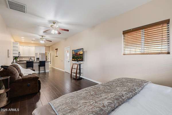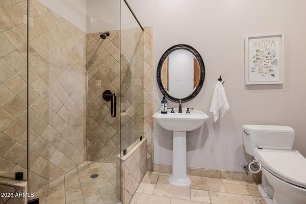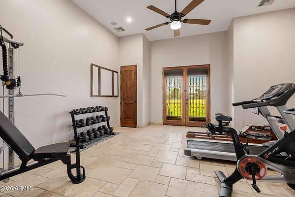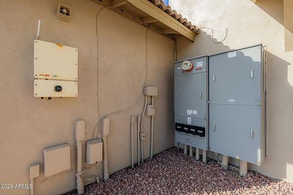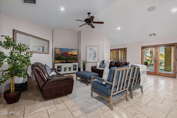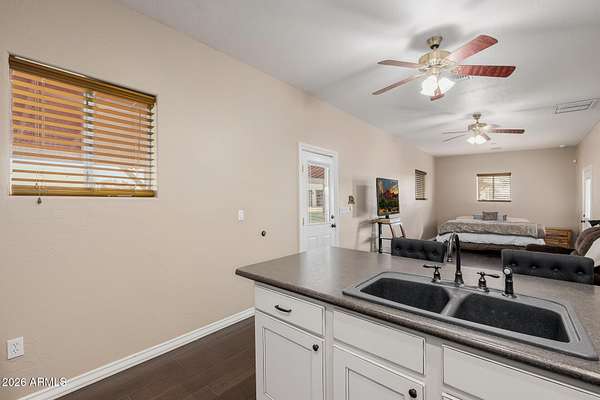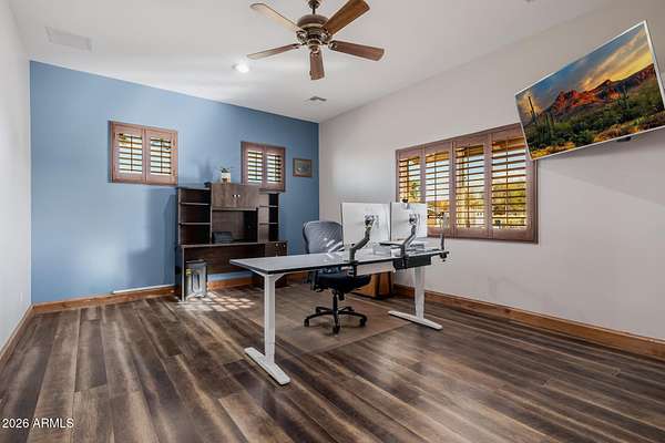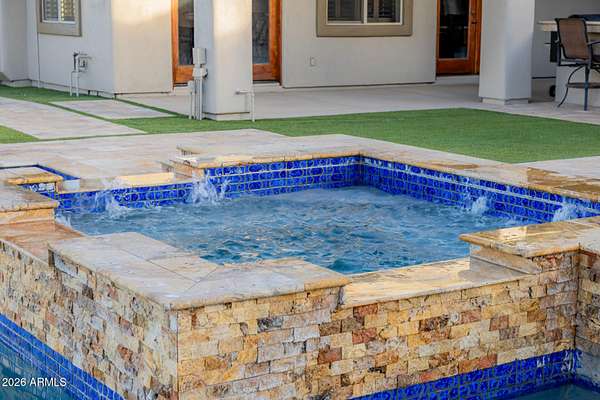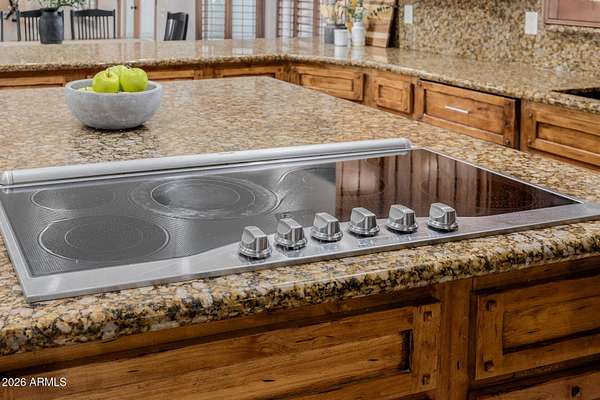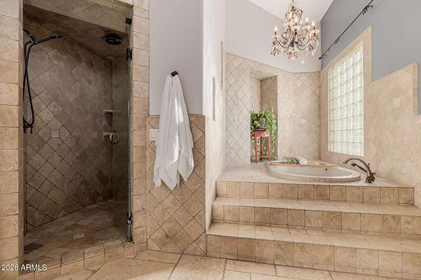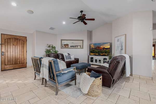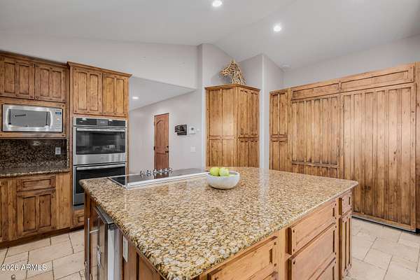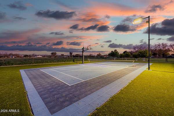 If you've been dreaming of a place where every day feels like a getaway, this exceptional estate delivers. Situated in one of Gilbert's most sought-after areas, this quiet and private property spans nearly 5 irrigated acres, an offering that rarely comes to market. The seller invested extraordinary care into the home, sparing no expense and thoughtfully upgrading every detail throughout. The custom single-level main residence of almost 6,600 sqft. offers 5 beds, 4 beautifully tiled natural stone baths, 2 laundry rooms, plus spacious bonus room that could easily function as a 6th bedroom with exterior access. Guest house! One of the home's most impressive features is the expansive 1,250 sqft. game room, showcasing vaulted wood-beam ceilings, a stone fireplace, a built-in dining table and a custom oak wraparound bar and ideal setting for entertaining. Multiple doors open to the backyard, creating seamless indoor-outdoor living.The great room flows effortlessly into the gourmet kitchen, which is equipped with newer dual dishwashers, a wood-front Sub-Zero refrigerators, high-end stainless-steel appliances, a built-in Sonic-style ice maker, a large granite slab island, and a six-seat breakfast bar. The primary suite serves as a private retreat, featuring a spa-inspired jetted soaking tub, steam shower, rain shower, bidet, separate sitting area, and direct access to the backyard oasis. Throughout the home, you'll find travertine tile, 3/4-inch hardwood, engineered wood flooring, and carpet in two bedrooms. Custom solid alder wood cabinetry adds warmth and craftsmanship throughout. In addition to the main home, the property includes a 650 sqft. guest/pool house perfect for guests or multi-generational living with a full kitchen, laundry room, and bathroom with tiled shower. The estate offers an attached two-car garage as well as a detached workshop/garage with space for two oversized vehicles. RV hookups are available at both garages, along with a Tesla charger and upgraded 600-amp electrical service at the main home, making it solar-ready. Designed for both relaxation and entertainment, the resort-style backyard features a 45,000+ gallon heated pool with a waterslide and diving board, an eight-person spa, artificial turf, a two-way fireplace, and a large outdoor kitchen with seating for twelve, a gas grill, coolers, and sink. For equestrian or outdoor enthusiasts, the property also includes a pasture, large riding arena, round pen, barn, covered hay storage, and four covered horse stalls. A lighted sport court with speakers accommodates basketball, volleyball, tennis, pickleball, and more. Recent improvements include new exterior paint, a new barn roof, refreshed front and back landscaping with pavers and new rock, water softeners for both residences, upgraded attic insulation, and a new concrete septic tank for the guest house. This is a truly rare opportunity a private, impeccably maintained estate designed for enjoying life at its best, both indoors and out. Just minutes to Gilbert's top restaurants, premier shopping, fitness studios, and everyday conveniences.