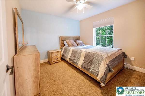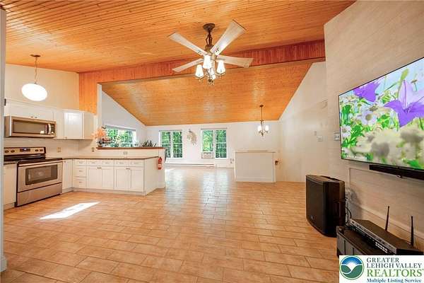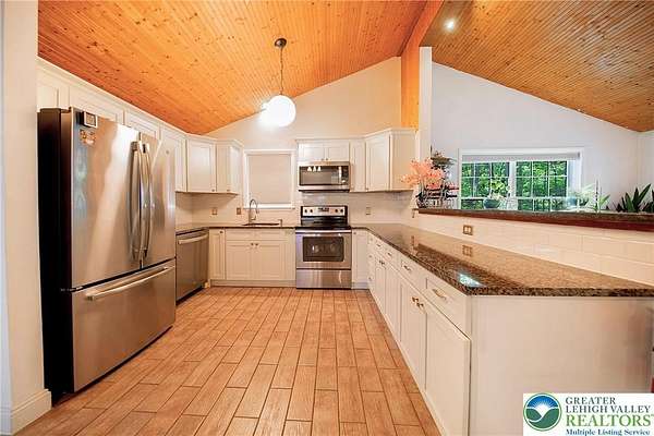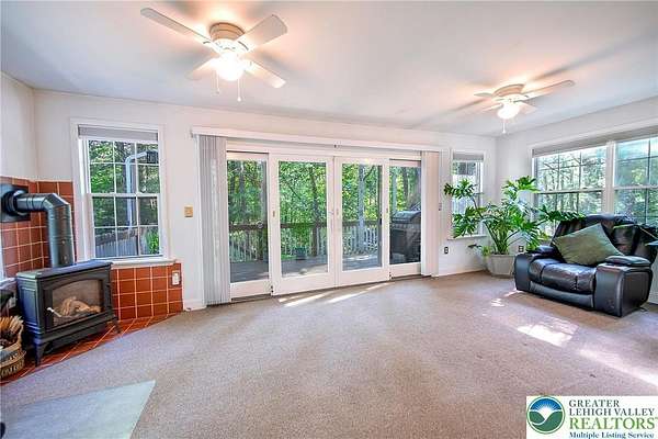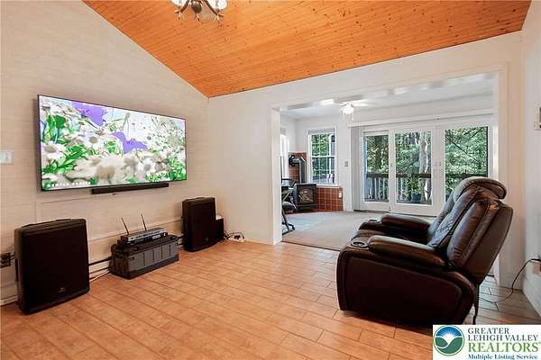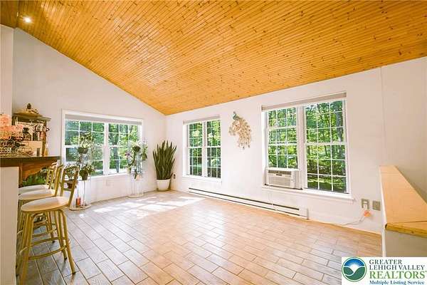 Offering 2,140 sq ft of living space, this home sits on a spacious 2-acre lot surrounded by mature trees, creating a serene backdrop and plenty of outdoor space to enjoy. Accented with vaulted wood ceilings and abundant natural light, this 3-bedroom, 2-bath property features a seamless layout designed for comfortable everyday living. The main level includes a welcoming family and dining area along with a modern kitchen highlighted by granite countertops and a classic subway tile backsplash. An all-seasons sunroom with a propane stove provides year-round relaxation and opens directly onto a large covered deck. The lower level offers a generous living room with a second propane stove, a full bathroom, laundry area, and a spacious primary bedroom with ample closet space. Additional advantages include no HOA and the flexibility of being located in a short-term-rental-friendly township.
