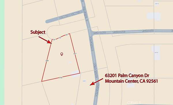 To locate the parcel, please use the neighbor's address, 63201 Palm Canyon Dr, Mountain Center, CA 92561; then use the following NW corner coordinates: 33.595436, -116.465815, second parcel on the left on St. Maurice Drive.