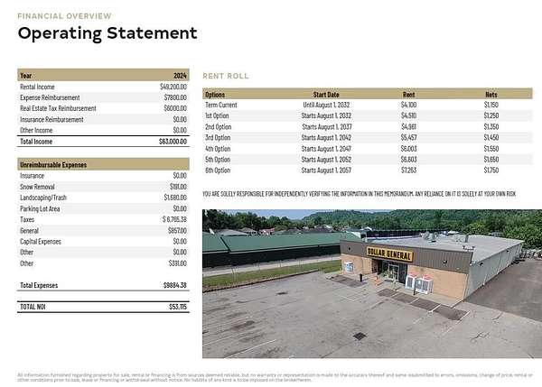 This asset is situated in an underserved, tertiary market, making it an essential part of the local retail landscape. The location was selected through Dollar General's proprietary, data-driven site selection process, which identifies underserved communities with strong consumer demand and limited retail alternatives. As a result, this location benefits from a built-in customer base and minimal competition, ensuring continued performance and long-term viability. With no other grocery option in Lesage, the Dollar General serves as the primary retail destination for local and regional residents. It offers a broad selection of everyday necessities, including food and beverages, health and beauty products, cleaning supplies, pet care items, and more. The store sees steady foot traffic and strong customer loyalty, driven by the absence of other national retailers in the area. For many residents, Dollar General is the most convenient and cost-effective option for household essentials. Financially, the property offers compelling fundamentals. It boasts an extremely low cost of occupancy, resulting in above-average store level profitability. There are currently 5+ years remaining on the firm lease term, with six additional 5-year renewal options, providing a long runway of predictable income backed by contractual rent increases. This ensures built-in NOI growth over the life of the investment.
