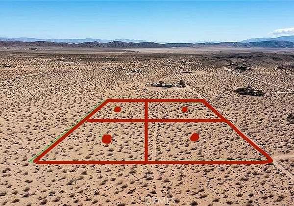 Incredible builder/developer opportunity! Four contiguous 2+ acre parcels (APNs 0605-231-44, 45, 46 & 47) sold together--each nearly RTI (Ready-to-Issue) for a custom home, ADU and private pool, each with its own address. Survey and percolation test completed. Will-serve letter secured from Joshua Basin Water District; power nearby. No Joshua trees impacting development. Stunning unobstructed views of Joshua Tree National Park, close to paved Border Ave and minutes to downtown. Designed for STR or luxury desert living perfect for investors. No seller financing.