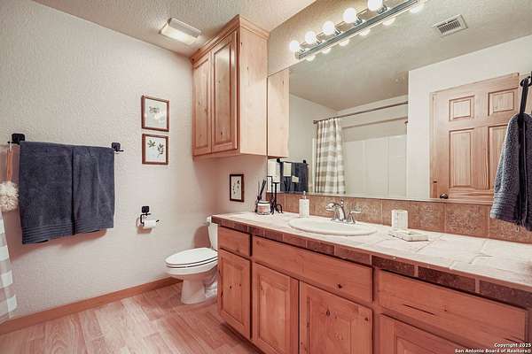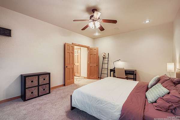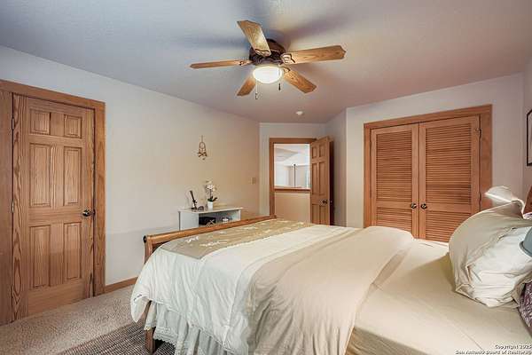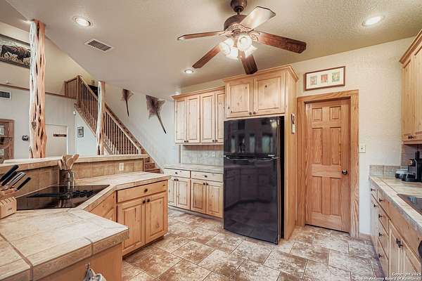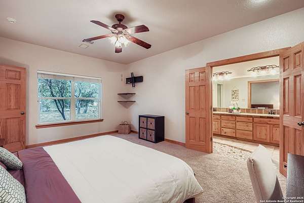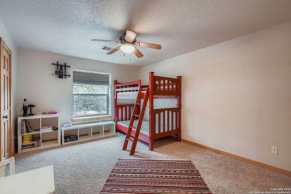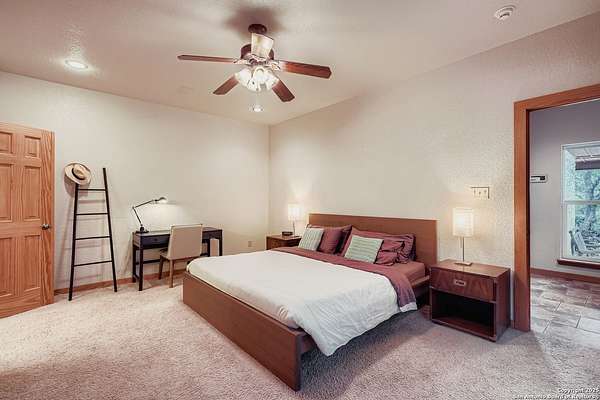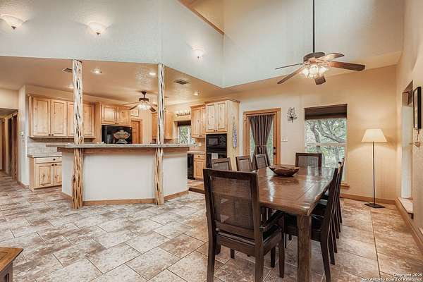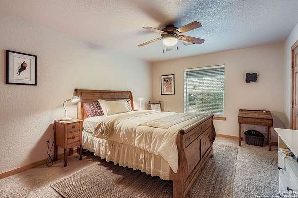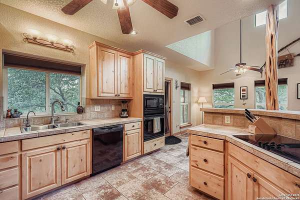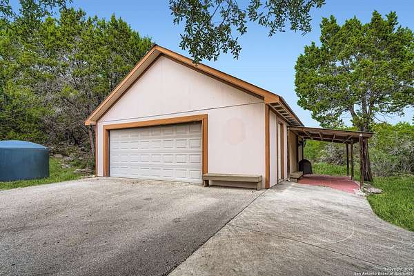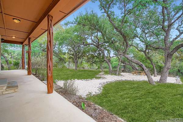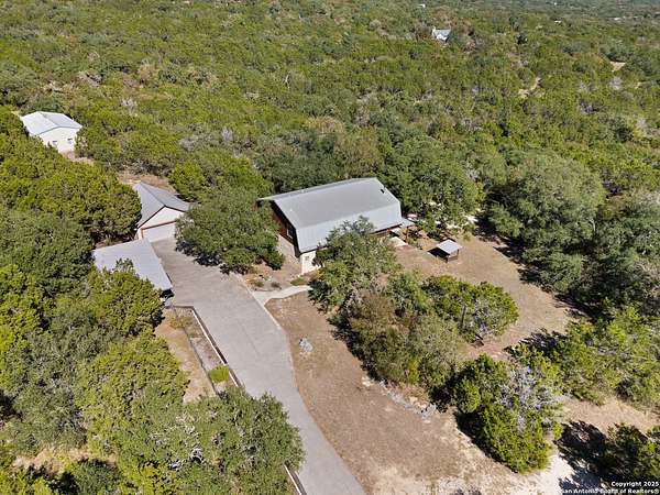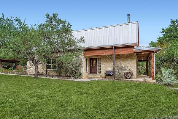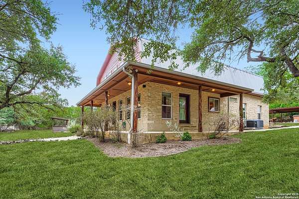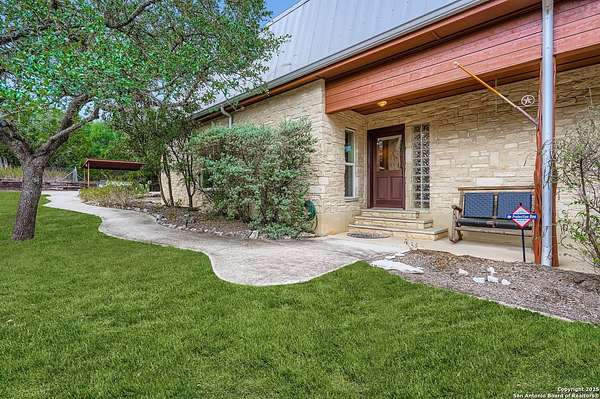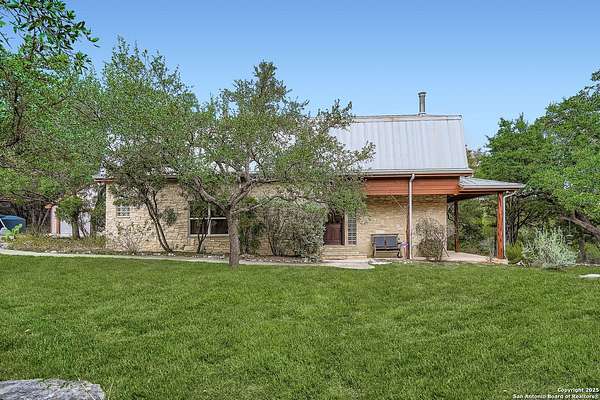 Texas Hill Country charm meets modern comfort. This private, gated retreat blends character, functionality, and thoughtful design on 5 acres, the perfect balance of rural seclusion and everyday convenience. Just 20 minutes from New Braunfels, you'll enjoy easy access to shopping, dining, and entertainment while still feeling a world away. Inside, soaring ceilings and abundant natural light set the tone. The open layout features tile flooring in main living areas, ideal for pets and built-in storage systems that maximize every inch of space. Outdoors, enjoy room to roam and entertain, with ample space for animals, gardens, or gatherings under the Texas sky. A 7,500-gallon rainwater collection system, 2x6 construction, Cat-5 data wiring, and a four-zone speaker system reflect the home's blend of craftsmanship and convenience. The oversized, insulated two-car garage is fully finished and ready for projects or extra storage. Character, privacy, and modern livability, all in one Hill Country haven.