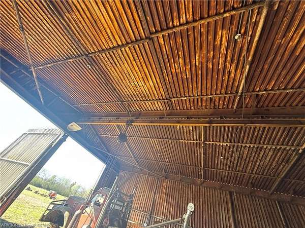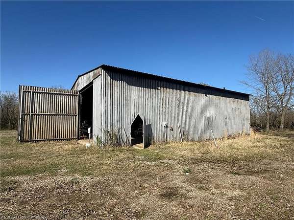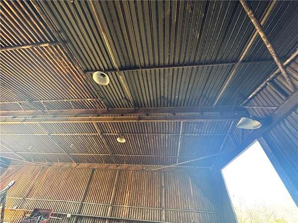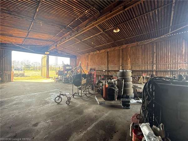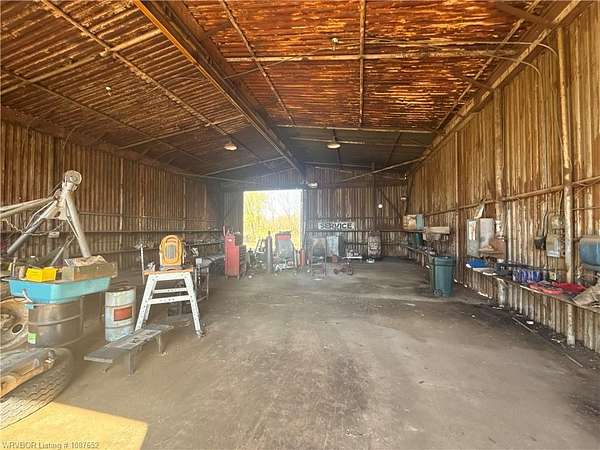 Per the seller, this property was a long standing welding and tow company shop. It has working electricity, and per the seller, the lighting works as well. It is adjacent to highway 71, lies next to the Poteau River, and has the Waldron City Pond behind it. It is 2400 sq ft with a concrete floor, and work table on sides of shop, with 3 large doors and a large chain hoist on a trolley that runs the length of the shop.
