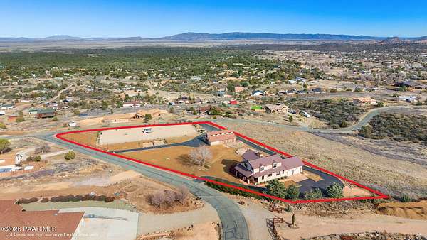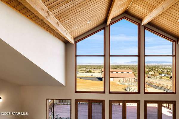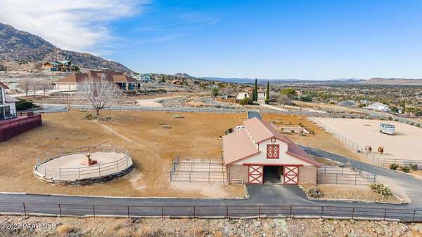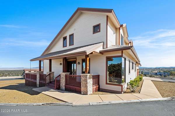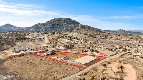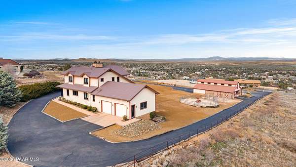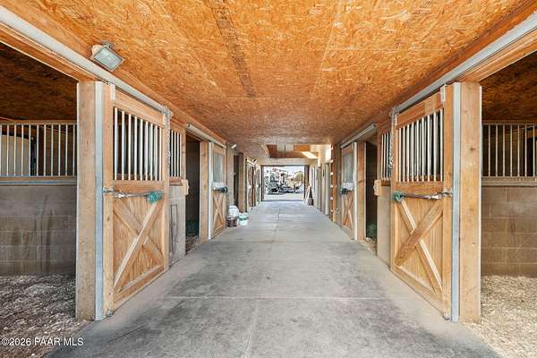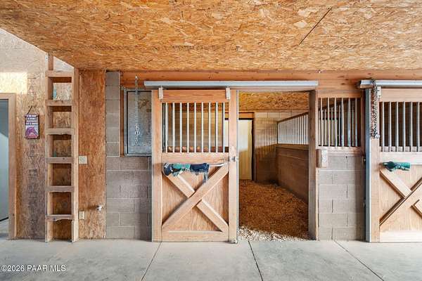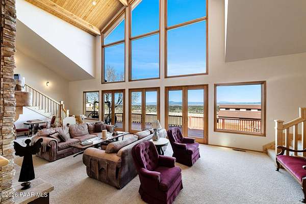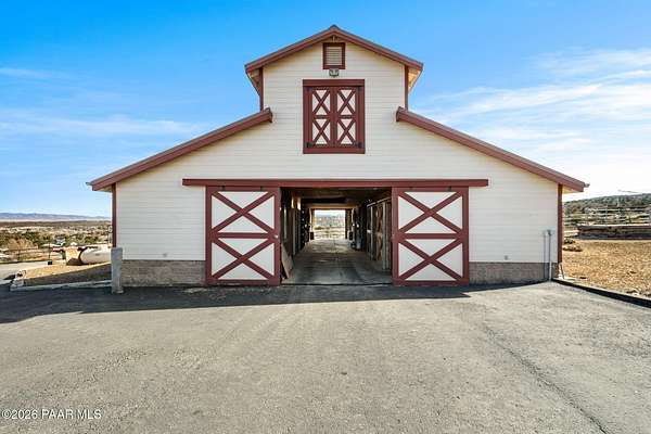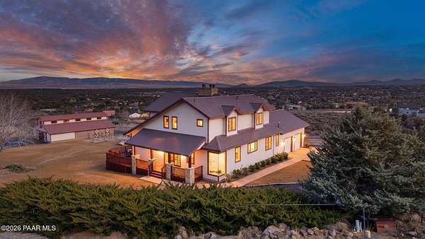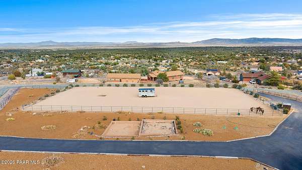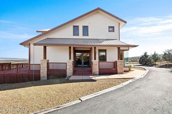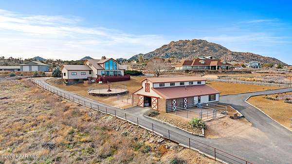 Set on 2.43 acres of pristine equestrian grounds, this stunning custom mini-ranch offers a rare blend of luxury, privacy, and thoughtful design. Created with both comfort and functionality in mind, the property is a dream for horse enthusiasts and entertainers alike. At the heart of the home, an inviting living room showcases a dramatic floor-to-ceiling stacked stone fireplace, flanked by dual staircases that add architectural interest. An expansive wall of dual E-hi solar windows floods the space with natural light while framing breathtaking panoramic views extending to the San Francisco Peaks. The chef's kitchen anchors the home, perfectly suited for both everyday living and hosting. Each private primary suite is its own retreat, featuring a cozy fireplace and a full en-suite bath. Entertaining is effortless with a full wet bar and expansive deck. While a private sauna offers a serene escape after a long day. Equestrian amenities are nothing short of exceptional, including four 12x12 stalls with automatic waterers, each opening to its own 12x24 turnout. The well-appointed barn also features a tack room, hay storage, office, and storage room, along with a charming bunkhouse complete with a spacious bedroom and bathroom. A wash rack with hot and cold water, a 100x200 riding arena, and a hot walker round out this extraordinary property. This refined estate seamlessly blends upscale living with world-class equestrian facilities, all set against a truly breathtaking Northern Arizona backdrop.