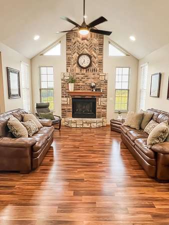 Nestled on just under two acres mere minutes from Nixa, this delightful home masterfully blends a tranquil country setting with unparalleled convenience. Inside, you'll find a bright and airy floor plan featuring three bedrooms and two full bathrooms, highlighted by a comfortable living room with vaulted ceilings and a cozy wood-burning fireplace (now seamlessly updated with an electric insert). The heart of the home is the generous kitchen, with stainless steel appliances, gleaming granite countertops, and abundant cabinet and counter space that flows into a nicely sized dining area.The serene primary retreat boasts an elegant trayed ceiling and private access to a deck, alongside luxury inclusions like a jetted tub, a step-in shower, and dual vanities, and a large walk-in closet. Recent, thoughtful updates throughout ensure peace of mind: a new roof (2024), water heater (2025), HVAC system updates (2022), refreshed paint, modern flooring, and new kitchen counters and appliances. A practical side-entry three-car garage caps off this offering. Best of all, the property backs directly to open pastureland, where you can enjoy peaceful views and the gentle company of neighboring horses--a perfect haven for those seeking both modern comfort and a rustic rural connection.