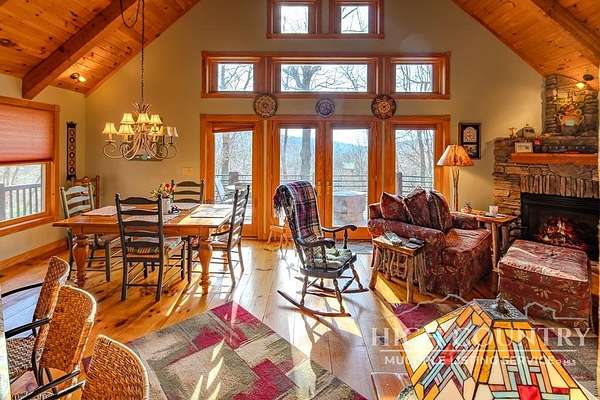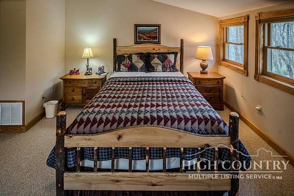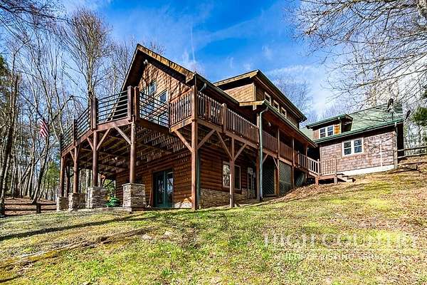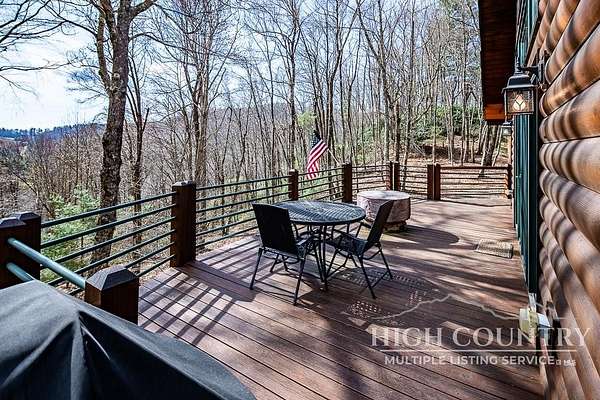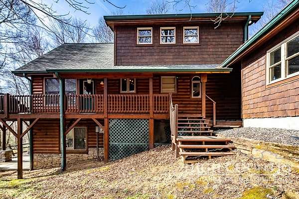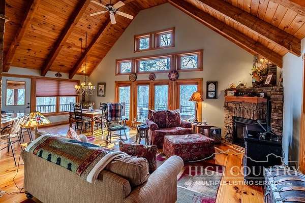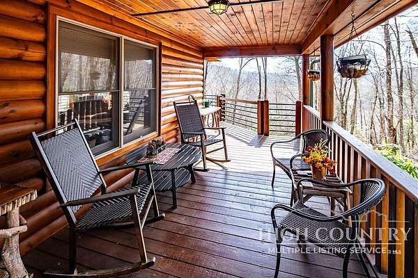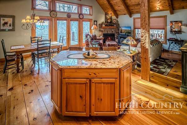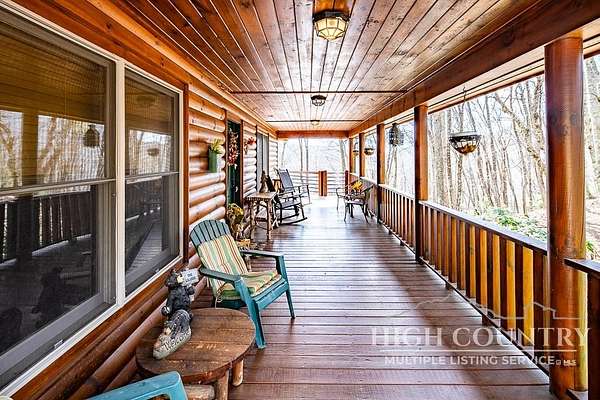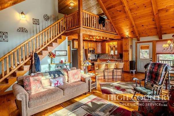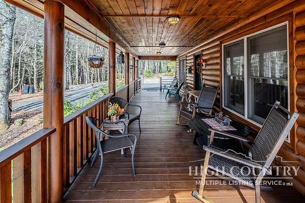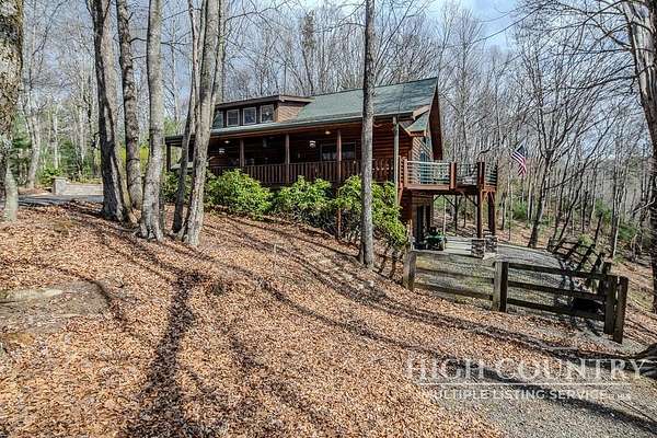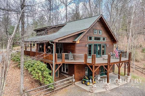 Discover a stunning and well-maintained log cabin located near the Blue Ridge Parkway, set on 2.66 acres in the beautiful mountains of West Jefferson. This remarkable home features three bedrooms and three full bathrooms. Inside, you'll find wide plank wood floors, a tongue and groove vaulted ceiling with exposed beams, a stacked stone fireplace, and ample natural light. The open kitchen seamlessly connects to the living room and dining area, allowing you to enjoy stunning mountain views from indoors. Alternatively, you can step outside to one of the multiple deck spaces for outdoor relaxation. The main level offers a primary bedroom with an en-suite full bath, as well as a convenient laundry area. Upstairs, there is an open loft overlooking the living room, along with a second bedroom and another full bathroom. The fully finished basement includes radiant heated floors, a spacious sitting area, a wet bar, a third bedroom, a full bath, and a second fireplace. Additional features include an oversized two-car garage with a full loft for extra storage and a partially fenced yard. Don't miss the chance to see it today!