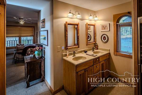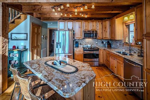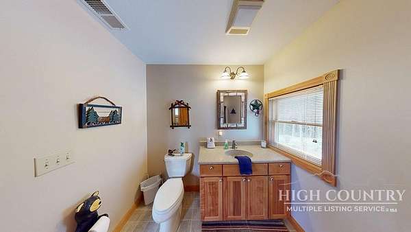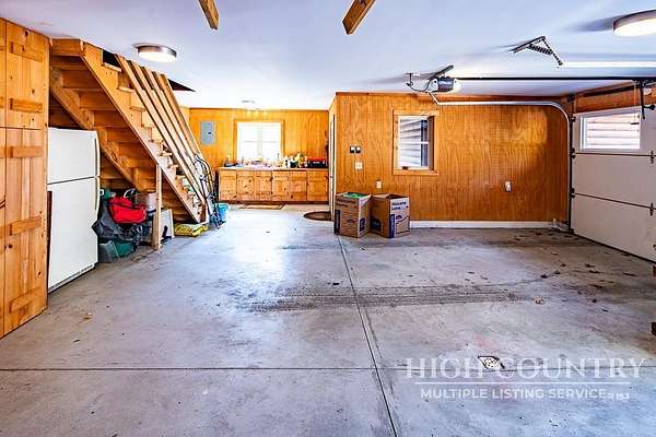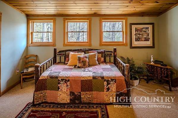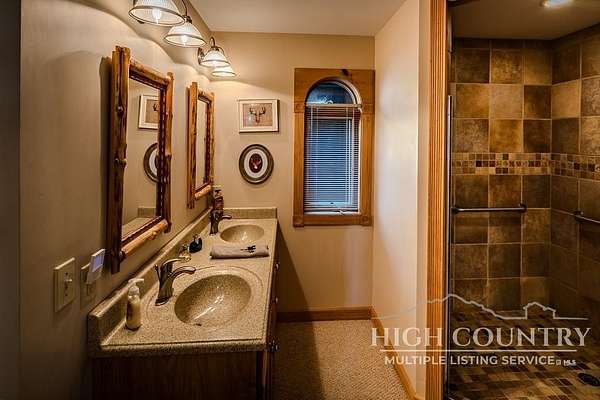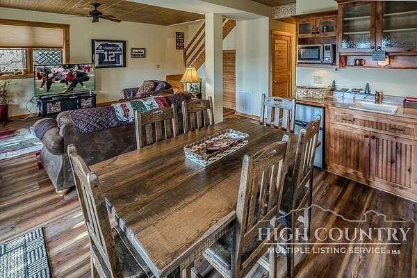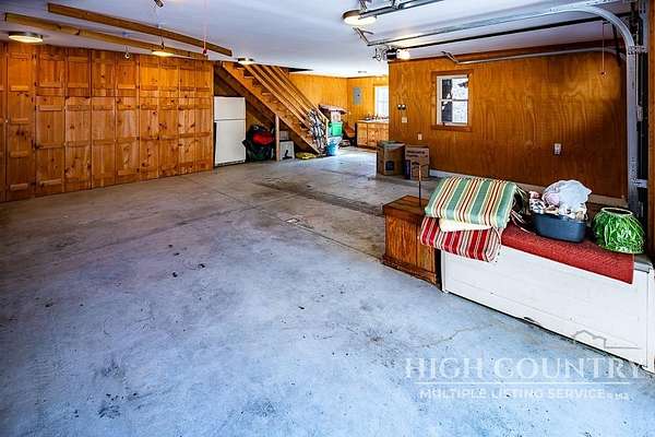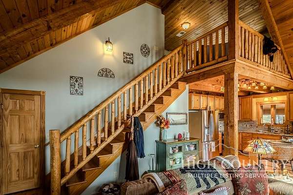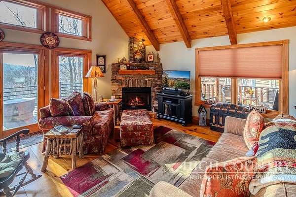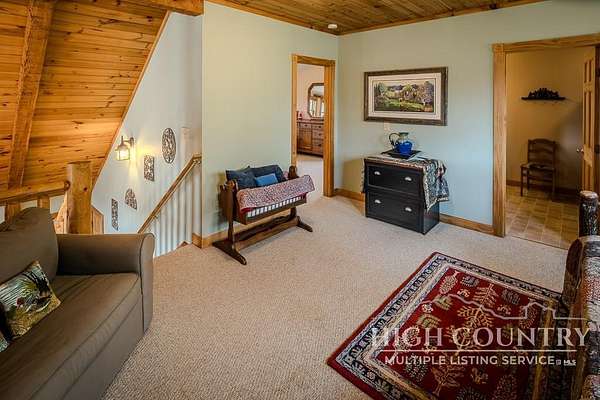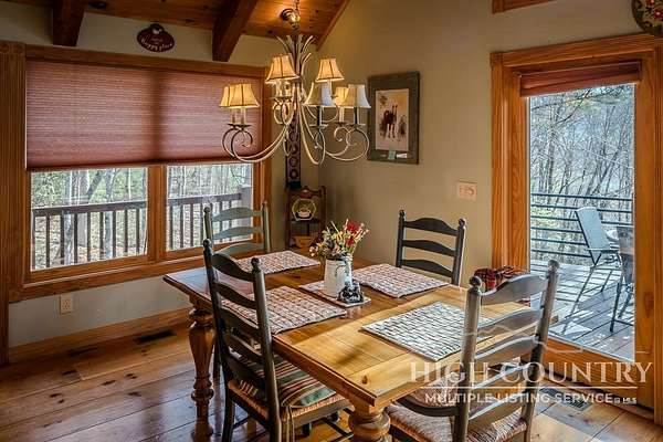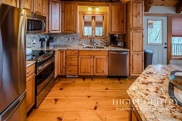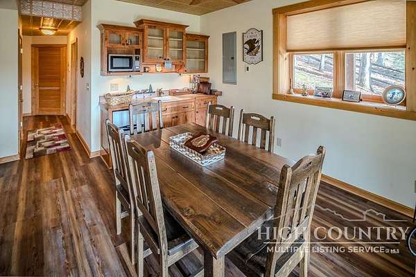 Discover a stunning and well-maintained log cabin located near the Blue Ridge Parkway, set on 2.66 acres in the beautiful mountains of West Jefferson. This remarkable home features three bedrooms and three full bathrooms. Inside, you'll find wide plank wood floors, a tongue and groove vaulted ceiling with exposed beams, a stacked stone fireplace, and ample natural light. The open kitchen seamlessly connects to the living room and dining area, allowing you to enjoy stunning mountain views from indoors. Alternatively, you can step outside to one of the multiple deck spaces for outdoor relaxation. The main level offers a primary bedroom with an en-suite full bath, as well as a convenient laundry area. Upstairs, there is an open loft overlooking the living room, along with a second bedroom and another full bathroom. The fully finished basement includes radiant heated floors, a spacious sitting area, a wet bar, a third bedroom, a full bath, and a second fireplace. Additional features include an oversized two-car garage with a full loft for extra storage and a partially fenced yard. Don't miss the chance to see it today!