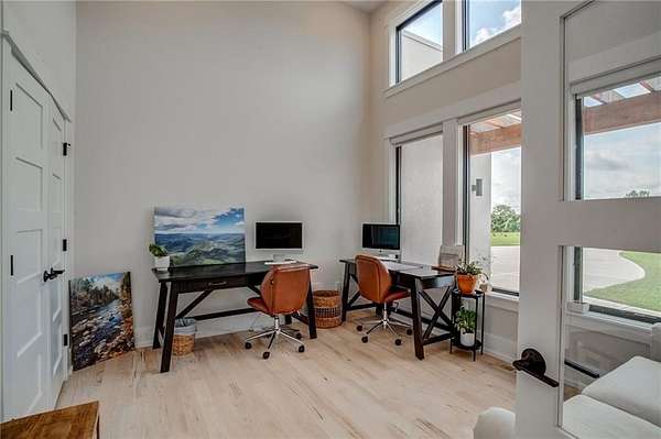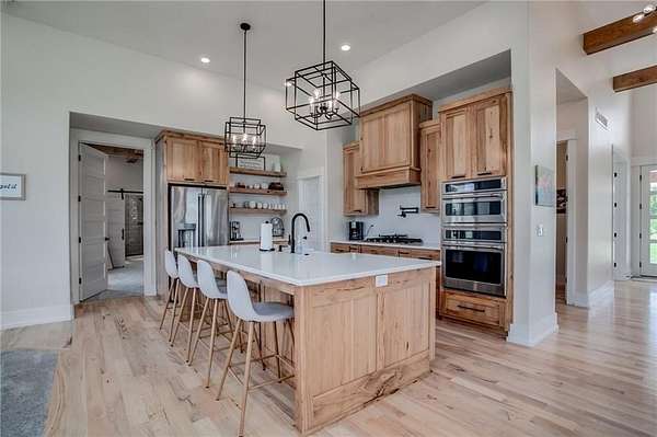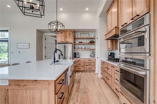 An Estate of Distinction on 5 Gated Acres! Set behind private gates and nestled on 5 pristine acres, this extraordinary custom estate defines refined living. Designed with both elegance and purpose, the residence showcases 4 bedrooms, 4 luxurious baths, and extraordinary accommodations for the collector or enthusiast with garage space for 6+ vehicles-including a remarkable 40x60 detached garage and fully powered workshop. -The interiors unfold with an airy open-concept design, where soaring windows frame the landscape and flood the home with natural light. A chef's kitchen anchors the living space, appointed with exquisite finishes and designed for both intimate gatherings and grand entertaining. Every detail reflects craftsmanship of the highest caliber. -On the lower level, a private exercise suite and an expansive, state-of-the-art theater room provide a lifestyle of leisure and wellness. For those seeking a truly unique vantage point, the rooftop deck offers an enchanting retreat-perfect for sunset gatherings, evening cocktails, or stargazing beneath an endless Missouri sky and sunsets. -Just moments from the waters of Smithville Lake, this estate seamlessly blends tranquility, recreation, and sophistication. A rare offering, it invites the next discerning owner to experience a life of privacy, beauty, and unparalleled luxury. Your private tour awaits.