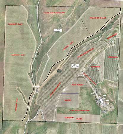 This prestigious and profitable 162.61 acre Olive Ranch and Vineyard is located in the rolling hills of the Paso Robles Estrella Appellation. Specializing in the growing and production of award-winning Extra Virgin Olive Oil and premium wine grapes. The property features a beautiful 4950 sq.ft. two story barn. The lower floor of the barn is equipped with a permitted bathroom, shower, water softener, laundry, and septic system. Heavy concrete paving surrounds the entire barn. Just off from the barn is a stunning open concept entertainment center with fountain, water misters for warm days and a beautiful fireplace for cool evenings. The shooting range located on the other side of the barn has a 10X10' concrete shooting stand, aiming out to movable short and long range targets. The property agricultural mainstay of the property is its 87 acres of vineyards (Cabernet Sauvignon, Sauvignon Blanc, Petite Sirah, Malbec, Petite Verdot, Sangiovese) and 15+ acres of Olive trees (Arbequina, Koronieki and Mixed Tuscan). The Vineyards have profitable leases, ending in 2028 and 2047. There is a 1 acre lavender field and another 18.8 acres of additional olive tree or vineyard expansion. Five 10,000-gallon water storage tanks co-located in a hill-top tank farm with electronic controls and water level indicators. The Irrigation system is gravity fed from tanks throughout the olive blocks and eastern part of the vineyard. The water is supplied by 2 permitted and vested wells. The wells are 650' deep and produce 70-100GPM with no water table issues. Water quality is excellent and water pressure is 35-50psi throughout. Forever views Gazebo: 16ft. diameter, octagon, Amish style shade gazebo on heavy elevated concrete slab with electric fan and lights and views. The Bergey 10 Kw Wind Turbine Generator mounted on a 100 ft. tall heavy duty, galvanized steel tower structure also supports a wi-fi repeater station that is leased, providing free high power internet and wi-fi service to the property. This stunning property has numerous possibilities for the building of a primary Residence. Truly a special place that makes beauty, prestige and profitability a reality.