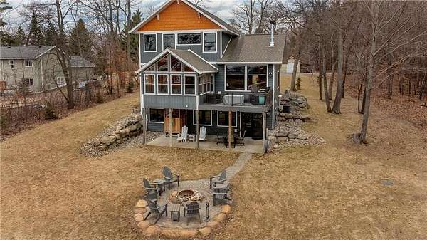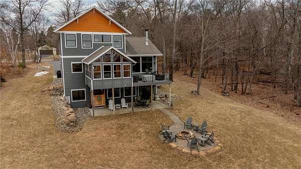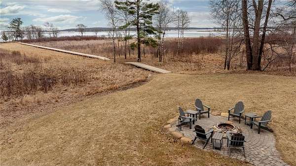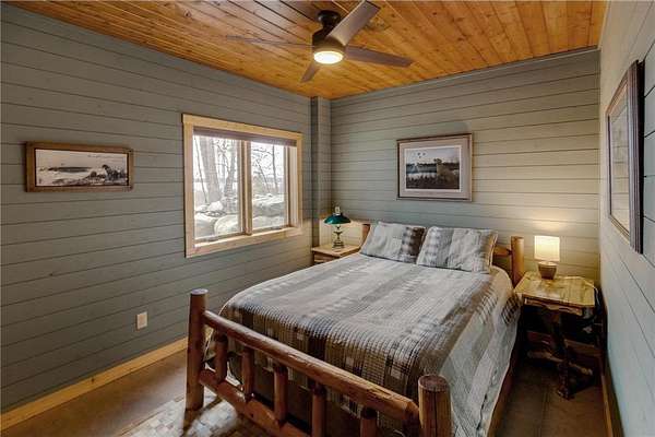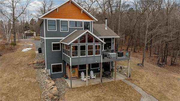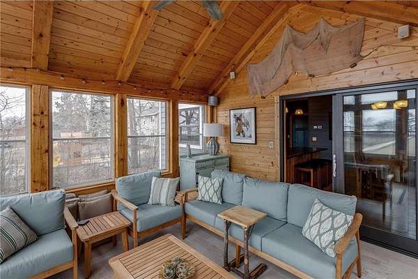 The exterior is a true Northwoods setting, boasting a sought-after sand shoreline.