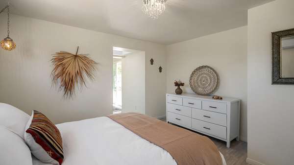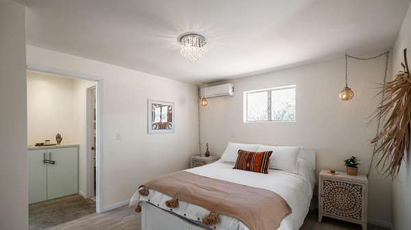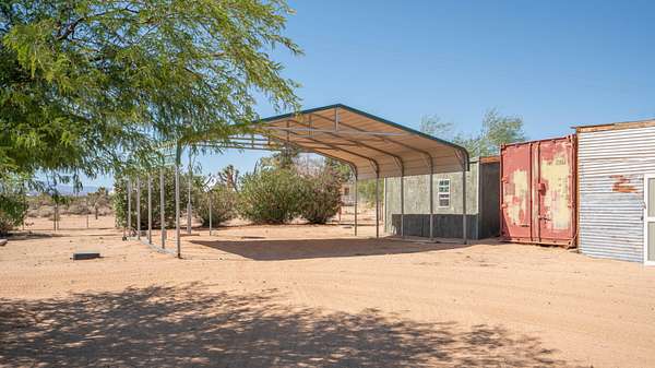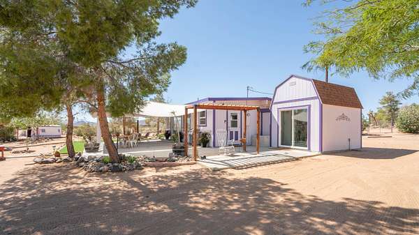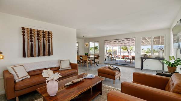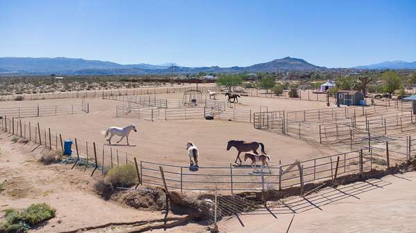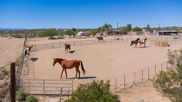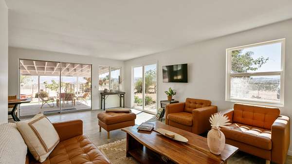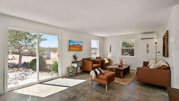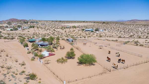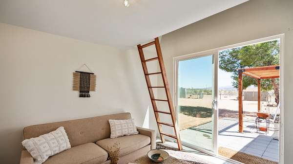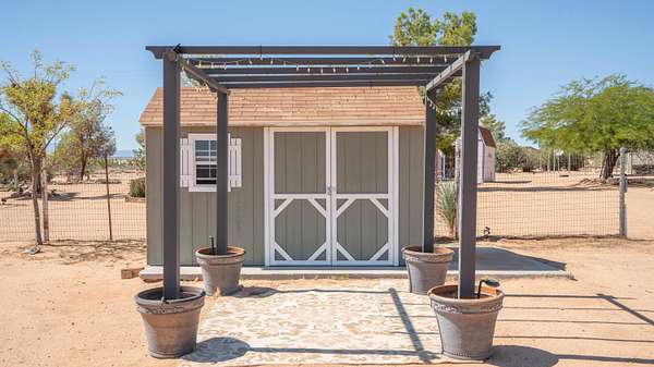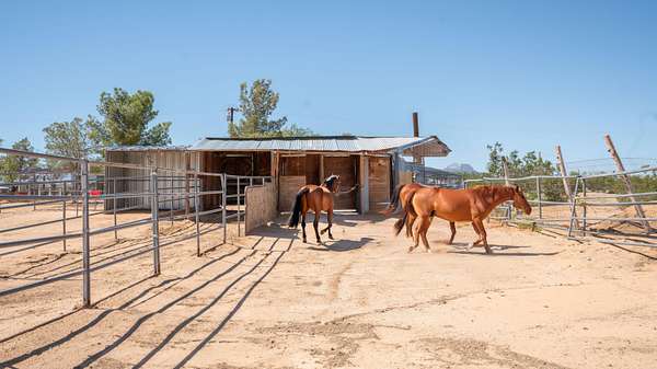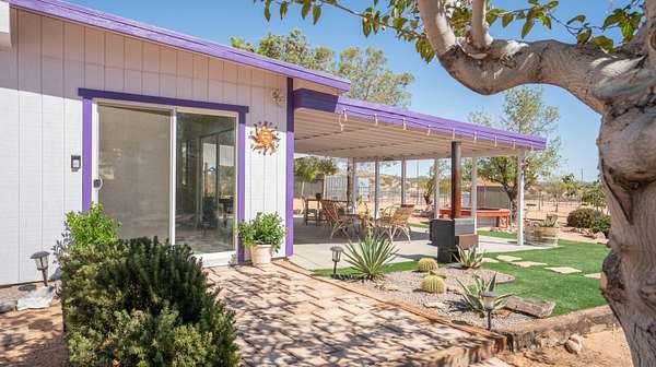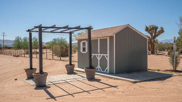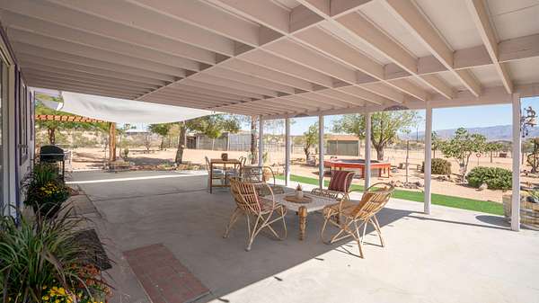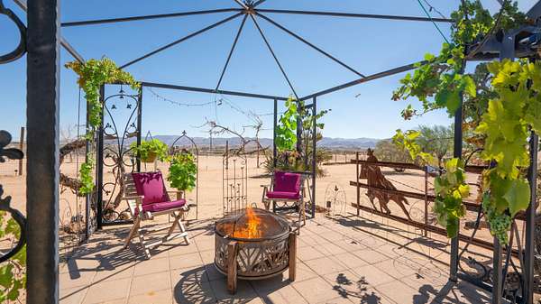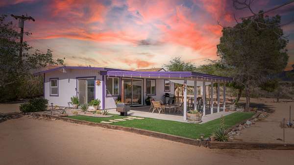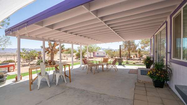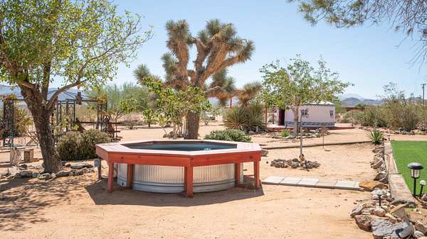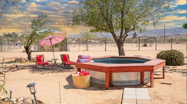 Calling all Horse Enthusiasts, Horse Trainers and those looking for a fabulous equestrian property. This wonderful Equestrian-Friendly Desert Retreat with your own Yurt on 5 Acres in Joshua Tree is it! Thoughtfully remodeled 1-bedroom, 1-bath home with a loft (approx. 660 sq. ft.) pairs modern comfort with true desert living. The open and inviting living room is spacious and has large picture windows that flood the interiors with natural light and frame sweeping mountain vistas. Outside, an expansive covered patio creates a generous setting for entertaining and lots of areas around the property to just sit, take a break enjoy the beauty of your surroundings. Property Highlights -Fully perimeter-fenced 5 acres: ideal for horse enthusiasts and animal lovers alike. -Equestrian facilities: 3 covered horse shelters with 50 ft paddocks, fencing and cross-fencing, round pen, turnouts, and a nice size tack shed. Lots of room for your horses to run and play or turn this property into a lovely training facility with lots of options for you and your horses. Lots of areas to ride and trails all over -Yurt with private deck: versatile bonus space perfect for guest accommodations, yoga, meditation, or creative work. - Outdoor amenities: low-maintenance landscaping with mature trees, rock/desert scape throughout, a cowboy soaking tub for beautiful sunny days or those gorgeous starry nights, and a rustic trellis-covered fire-pit area - Practical setup: RV hookups, storage containers, a large covered parking structure and all of it is flat usable land with tons of room to pull that truck and trailer in and out or to expand on the property. Small in size yet impressively efficient, this home delivers a seamless blend of indoor-outdoor living, rustic charm, and equestrian functionality. Welcome to an inviting, peaceful equestrian retreat in the heart of Joshua Tree. Buyer to verify all information. Buyer is advised to conduct all independent inspections and investigations of the property (including, without limitation, permits, square footage, lot size, boundaries, zoning/use, systems, and neighborhood rules) and to rely solely on Buyer's own findings. Seller and Brokers make no representations or warranties.