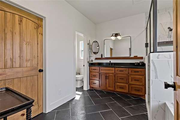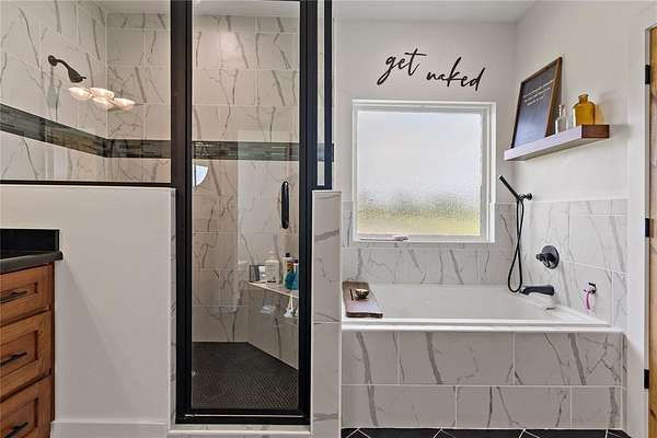 The master suite features a distinct bathroom with a separate tub and shower. This living space includes a large walk-in closet, with ample room perfect for organizing your wardrobe.