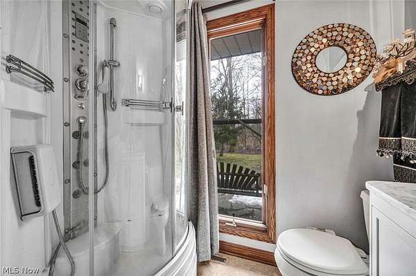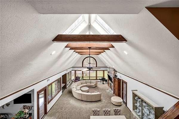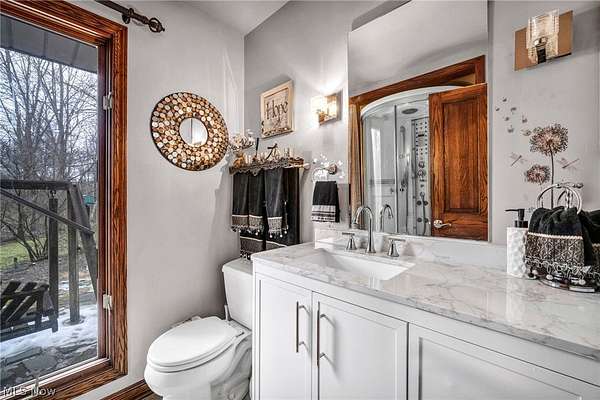 Situated on nearly five park like acres, this stunning property offers a private, serene setting complete with a picturesque pond and water fountain, mature trees, and approximately one acre of open lawn surrounded by peaceful woods. Designed for both everyday living and entertaining, the home features an open concept layout with a spacious kitchen offering exceptional storage and generous prep space. The first-floor owners suite provides convenience and comfort with two walk-in closets and a large en-suite bath. A dedicated office/flex space is also located on the main level. Upstairs you will find two bedrooms with wall-to-wall windows and oversized walk-in closets plus two additional walk-in closets in the hallway providing abundant storage throughout. The walk out lower level includes a bedroom, full bath, and kitchen, making it ideal for an in-law suite or extended living arrangement. Don't miss your opportunity to see this unique home!