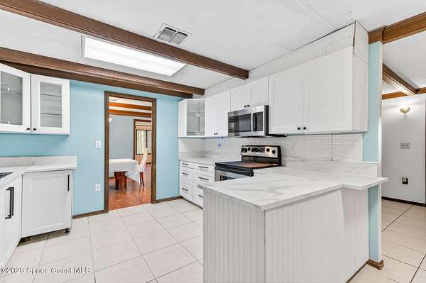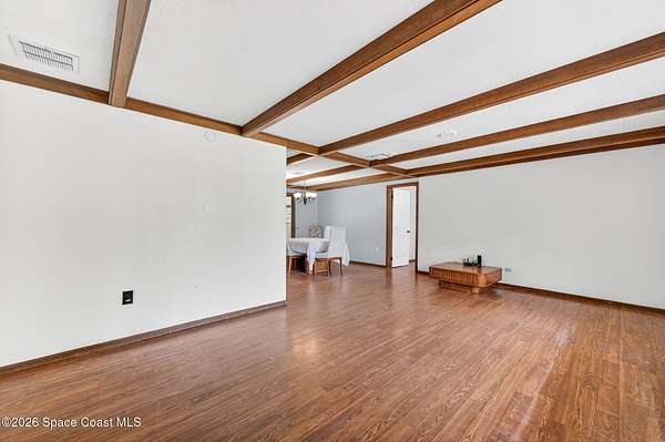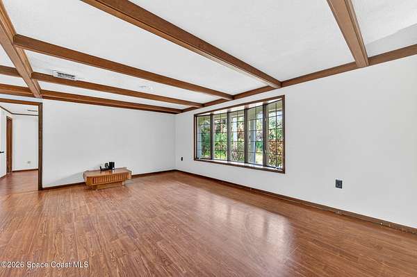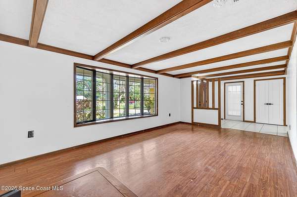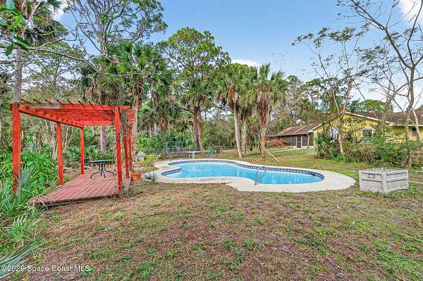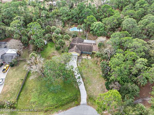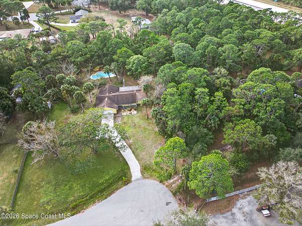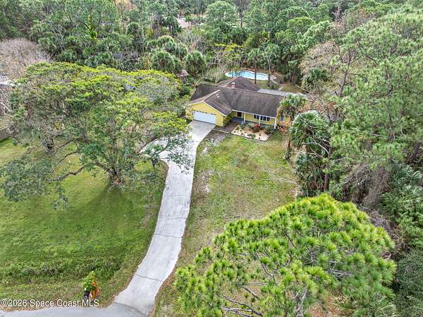 Welcome home to this charming 3 bedroom, 2 bath pool home on a quiet cul-de-sac, set on a spacious 1.86-acre lot. Zoned for horses, goats, chickens, and more, this unique country retreat offers privacy and versatility. Recent updates include HVAC (2025), chimney cap, remodeled kitchen, updated primary bath, instant tankless water heaters, new pool pump (2024), laminate flooring, solar tube, fresh interior/exterior paint. Low ceilings and excellent insulation make for lower electric cost. Outdoor features include a 7-foot-deep inground pool, cabana, fire pit, huge covered screened porch, shed, open barn, fencing, pond (low level with dry weather), and nature trail. No HOA-RV and boat parking allowed. Enjoy peaceful living near I-95 and the Beachline, less than 20 minutes to Titusville, Merritt Island, Rockledge, and Viera. Close to Airports, Schools, Dining and Entertainment.