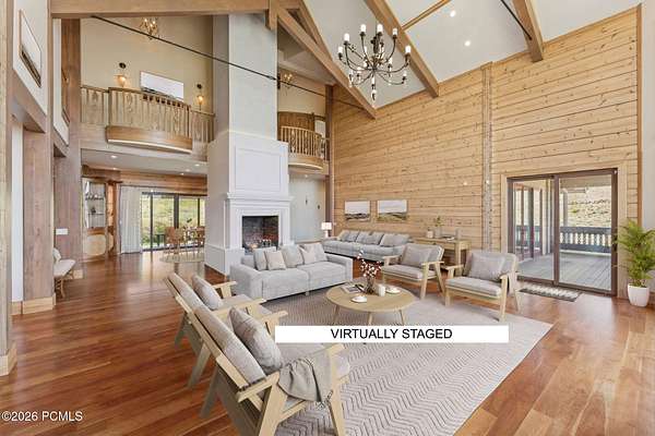If you've ever dreamed of exploring the stars from your own home, this is the place. This extraordinary Victory Ranch residence blends old-world European artistry with the awe of a private observatory, complete with telescope and retractable dome roof. With handcrafted details including a1,000 sq ft spa, gourmet kitchen, turret library, and panoramic views, this home is both imaginative and masterfully executed. A true one-of-one. Perched on 4+ acres, this architectural masterpiece overlooks the renowned Rees Jones-designed golf course. Designed with intention, this Honka home features custom pine timber from Finland. The construction is natural, sustainable, and free from synthetic insulation. Throughout the home, custom Venetian lighting highlights the exquisite craftsmanship. The living room boasts soaring vaulted ceilings and expansive windows that frame breathtaking views. At its heart is a one-of-a-kind four-sided fireplace adorned with hand-painted designs. The elegant kitchen is a chef's dream, with custom walnut, maple, and glass cabinetry, a walnut countertop with iridescent blue inlay. Adding to its uniqueness is a custom Pechka and pizza oven, hand-built on-site. The extraordinary library is housed in a stone turret with curved walnut & maple doors and inlaid custom floors. Above it, a private observatory serves as the home's crown jewel, equipped with a telescope & a retractable dome roof. The home features 5 luxurious suites, each with unique scenic views. Outdoor living is just as impressive, with a covered patio featuring a built-in grill and multiple balconies. A two-car garage and custom dog wash station complete the home. Victory Ranch is a gated community on over 6,250 pristine acres with 4 miles of private Upper Provo River access, offering a lifestyle of unmatched adventure and serenity.