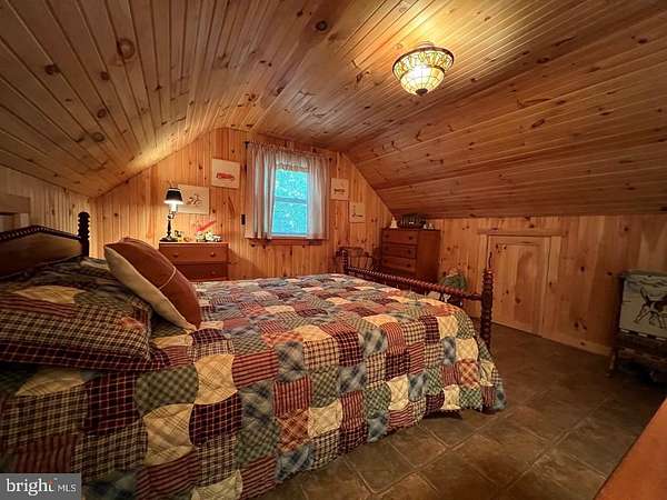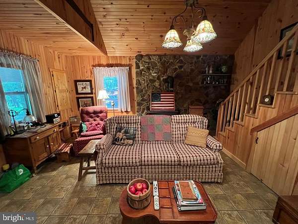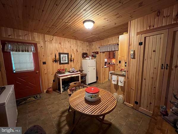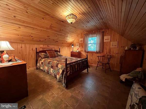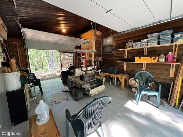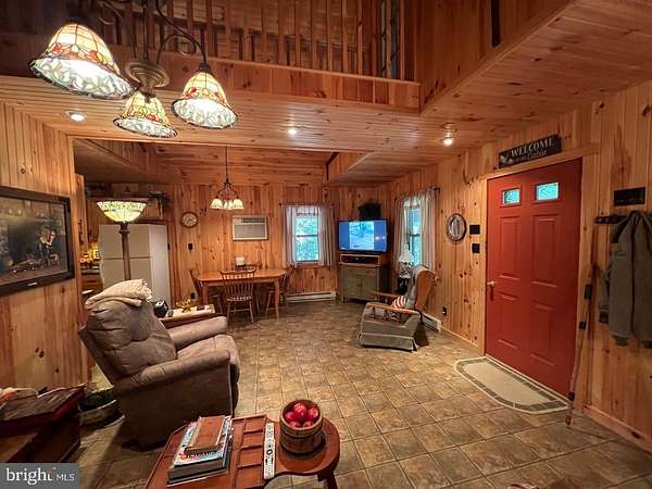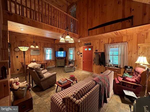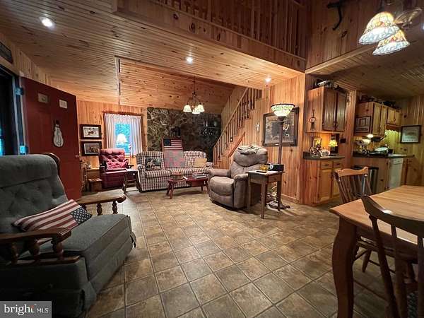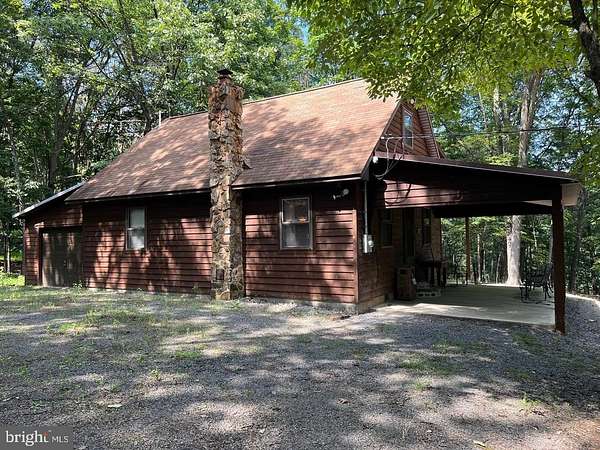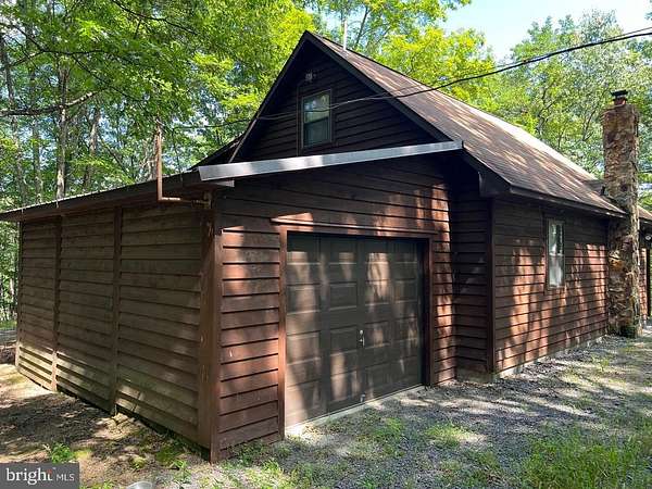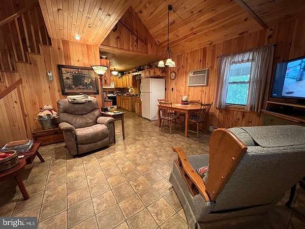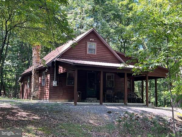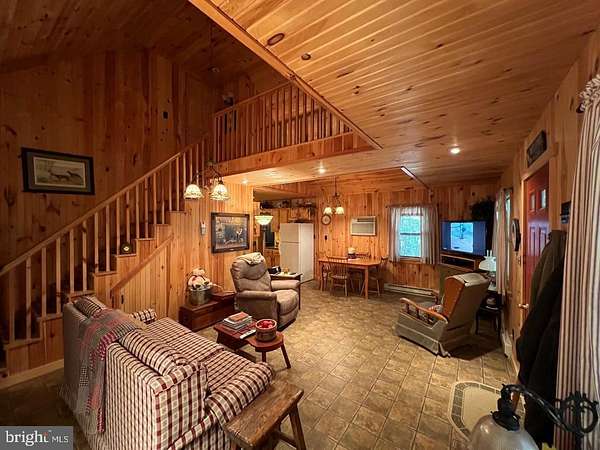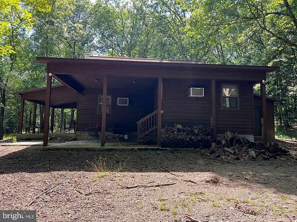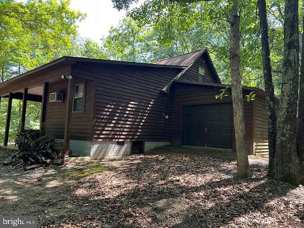 Escape to your private retreat on 11.43 acres across three lots, nestled in a gated community with sensible covenants. This charming 1995 cedar-sided cabin, centrally located on the property, offers 2 bedrooms, 1 bath, and a cozy open floor plan with wood walls and ceilings throughout. The main level features a bright living room, kitchen with all appliances conveying, and a dining area flowing seamlessly together. A versatile flex room off the kitchen includes stacked laundry in a wood-faced closet, pull-down ironing board, built-in office desk, coffee bar, and cabinet storage-perfect as a formal dining room or workspace. Stay warm with electric baseboard heat and a freestanding wood-burning stove accented by stunning stone, creating a fireplace-like ambiance. Vinyl floors, a main-level bedroom with ceiling fan, and a bathroom with walk-in shower (glass door and seat) plus electric space heater add comfort. Upstairs, a second bedroom with wood walls, balcony-style hallway, walk-in storage closet, and attic cubby provide ample space. Enjoy a concrete-covered front porch with stone entry steps, a side patio, and a pass-through 1-car attached garage. A storage shed and most furnishings convey. This well-maintained vacation home reflects true pride of ownership. The gated community offers 19 acres of shared land along the South Branch of the Potomac River for hiking and steep river access. Located 2.5 miles down county-maintained gravel roads, this secluded gem with well water, septic, and wall A/C units awaits your relaxation.