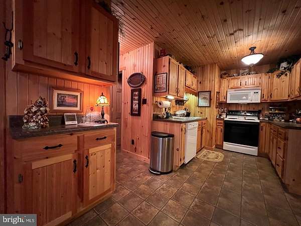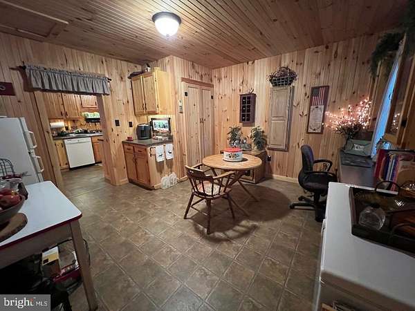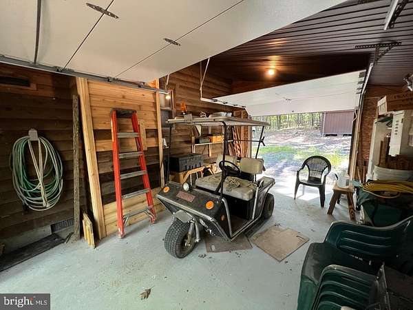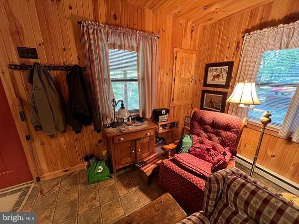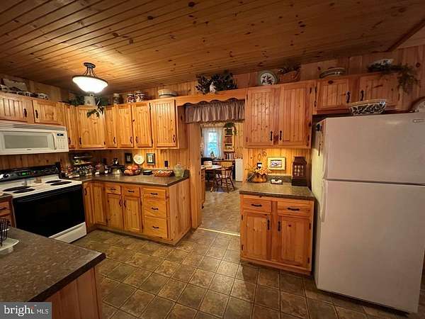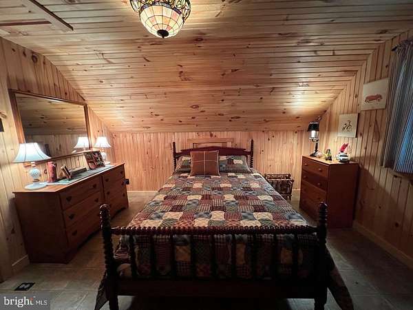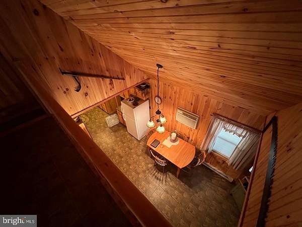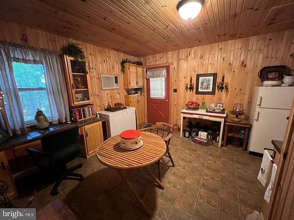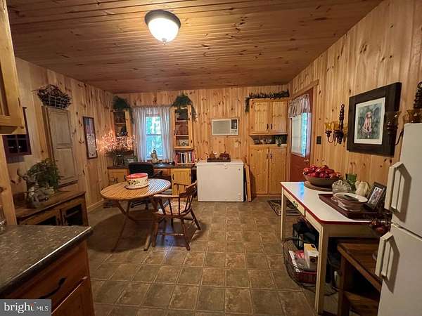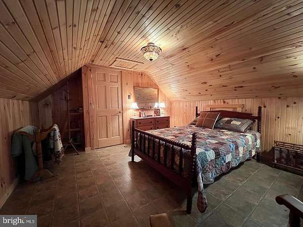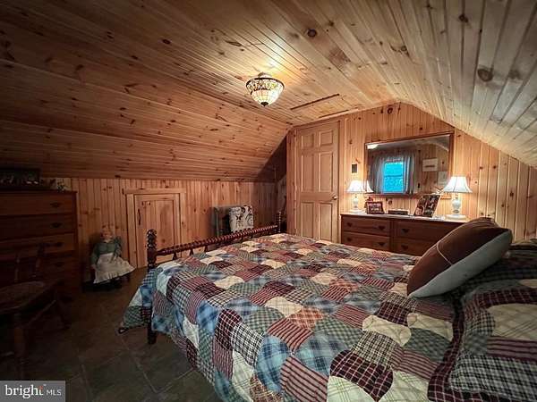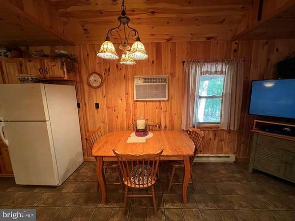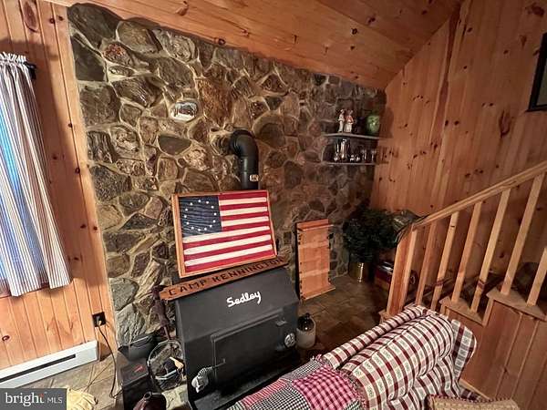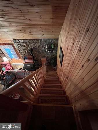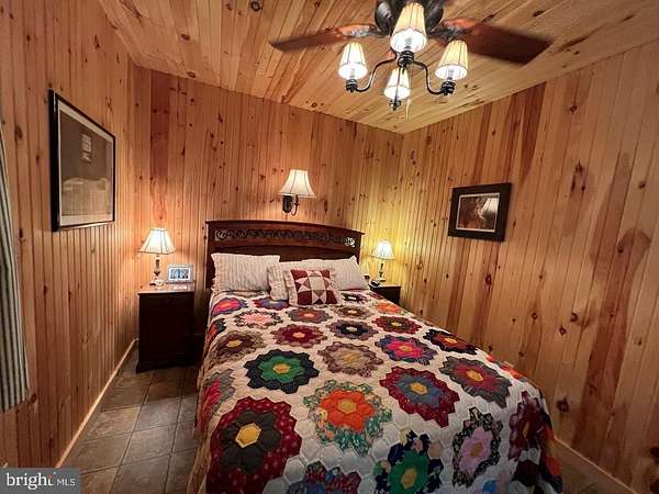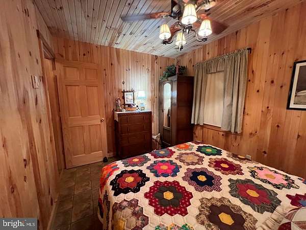 Escape to your private retreat on 11.43 acres across three lots, nestled in a gated community with sensible covenants. This charming 1995 cedar-sided cabin, centrally located on the property, offers 2 bedrooms, 1 bath, and a cozy open floor plan with wood walls and ceilings throughout. The main level features a bright living room, kitchen with all appliances conveying, and a dining area flowing seamlessly together. A versatile flex room off the kitchen includes stacked laundry in a wood-faced closet, pull-down ironing board, built-in office desk, coffee bar, and cabinet storage-perfect as a formal dining room or workspace. Stay warm with electric baseboard heat and a freestanding wood-burning stove accented by stunning stone, creating a fireplace-like ambiance. Vinyl floors, a main-level bedroom with ceiling fan, and a bathroom with walk-in shower (glass door and seat) plus electric space heater add comfort. Upstairs, a second bedroom with wood walls, balcony-style hallway, walk-in storage closet, and attic cubby provide ample space. Enjoy a concrete-covered front porch with stone entry steps, a side patio, and a pass-through 1-car attached garage. A storage shed and most furnishings convey. This well-maintained vacation home reflects true pride of ownership. The gated community offers 19 acres of shared land along the South Branch of the Potomac River for hiking and steep river access. Located 2.5 miles down county-maintained gravel roads, this secluded gem with well water, septic, and wall A/C units awaits your relaxation.