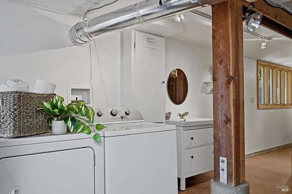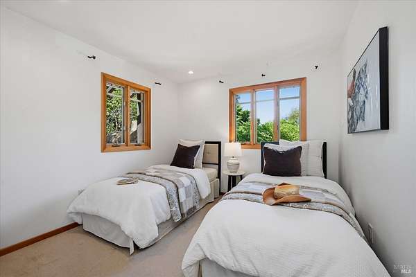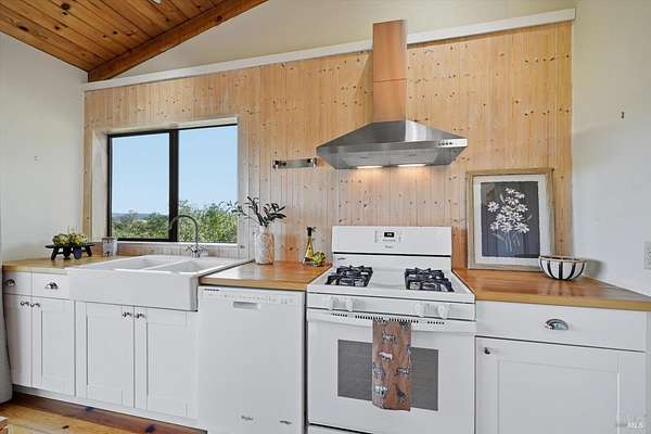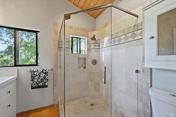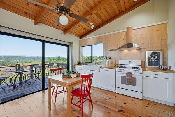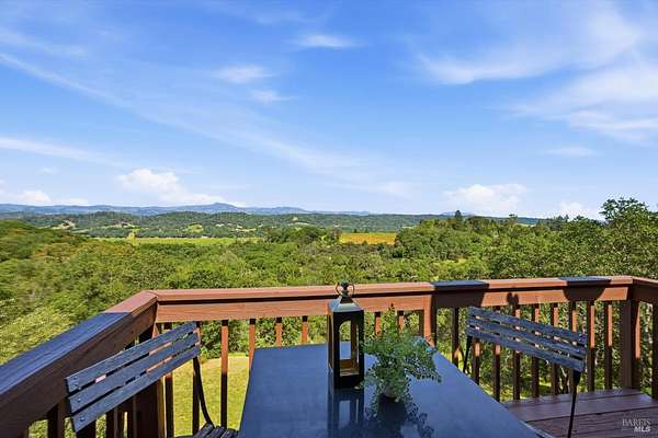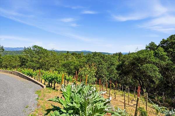 Experience the pinnacle of Wine Country living on this nearly 2-acre retreat, perfectly situated to capture breathtaking views of Sonoma County's Dry Creek Valley. Tucked at the end of a private road with no neighbors in sight, this property features a 3-bed, 2-bath mid-century modern main home and a 1-bed, 1-bath detached cottage. Surrounded by tiered gardens, a hobby vineyard, and tranquil oak woodlands, it offers a seamless blend of nature and sophistication. The main home boasts floor-to-ceiling windows, warm wood finishes, and an expansive deck with panoramic valley views, including Mt. St. Helena. The open living, kitchen, and dining areas flow effortlessly, while the private primary suite features a spa-like bath, walk-in closet, and private deck. Two additional bedrooms share a full bath, and the versatile lower level includes a flex space, laundry, wine cellar, and two-car garage with a workbench. Designed for outdoor entertaining, the property includes an alfresco kitchen with a BBQ, wood-fired pizza oven, and live-edge dining table. Winding paths lead through enchanting gardens, an orchard with citrus, plums,figs, apples, olives plus a ⅓-acre hobby vineyard planted with Zinfandel and Carignan. A seasonal creek, chicken coop, and storage shed add to the charm. The detached unit offers a private haven with a covered porch, tiered deck, vaulted ceilings, and stunning valley views. Its bright living room, open kitchen, cozy bedroom, and full bath make it ideal for guests, multi-generational living, or rental income. Located just 10 minutes from the Dry Creek General Store, 15 minutes from Highway 101, and 20 minutes from Healdsburg Plaza, this property combines luxury, privacy, and convenience, a true Wine Country paradise.