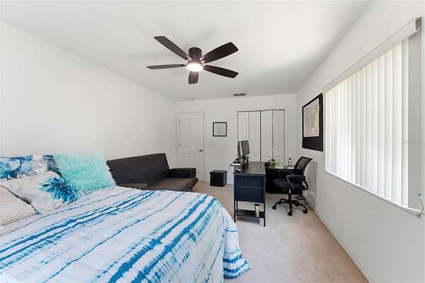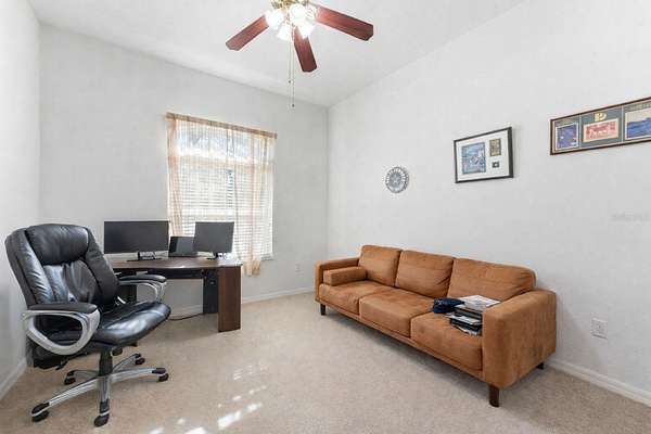 The kitchen overlooks the main living space and includes granite countertops, solid wood cabinetry, a center island, and bar seating, ideal for entertaining. The spacious primary suite and additional bedrooms provide comfortable separation, while a large dedicated office can easily function as a 5th bedroom or flex space.