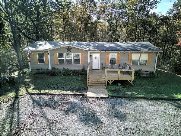 Welcome Home to 6343 Mount Pisgah Road! Escape to the serene beauty of the North Georgia mountains with this inviting double-wide home on 1.84+- private acres. Nestled among mature trees and rolling hills, this property offers a rare combination of comfort, privacy, and natural beauty. Imagine starting your day with morning coffee on the front porch, listening to birds sing, and watching the mist rise over the treetops. A large gravel driveway leads you to the home, complete with classic shutters, a storm door, and a front-yard storage shed, blending convenience with rustic charm. Step inside to the spacious living room, where luxury vinyl plank (LVP) flooring flows throughout the main areas. The open layout connects the living room to the kitchen and separate dining room, creating a space that's perfect for family gatherings or entertaining friends with mountain views as your backdrop. The kitchen features dark-stained cabinetry, a breakfast bar, a nice backsplash, and stainless-steel appliances, with a large window over the sink framing the tranquil, wooded backyard. Step into the laundry/mudroom, offering space for organization, storage, or gear after a day exploring the mountains. Retreat to the En-suite, featuring Vinyl flooring, and a private En-suite bath with double vanity, step-in shower, and built-in linen closet. Two additional bedrooms provide comfort and flexibility for family, guests, or a home office, while the guest bath includes a tub/shower combo and a vanity. Step outside to the back patio, where wooden steps lead down to a fire pit area, ideal for cozy nights under star-filled mountain skies, storytelling, or roasting marshmallows. The covered storage shed and private wooded backyard provide space for outdoor hobbies, gardening, or simply reconnecting with nature. Living here is about more than a home--it's a mountain lifestyle: crisp, fresh mornings, gentle breezes through the trees, seasonal color changes in the surrounding foliage, and the quiet solitude of a private retreat, all just minutes from local conveniences. 6343 Mount Pisgah Road is not just a residence; it's your personal North Georgia escape, where every day feels like a getaway.