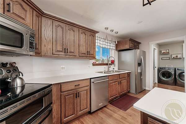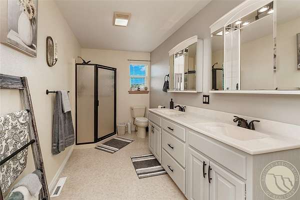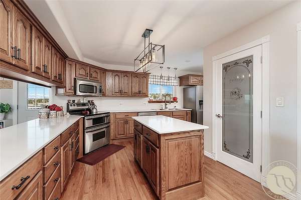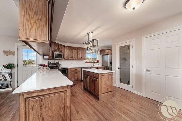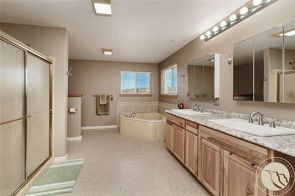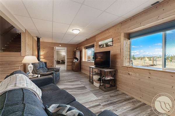 Spacious, well cared for multigenerational home on nearly 5 private acres, less than a 30 minute drive from Billings. This very large residence offers two fully separate living areas, ideal for extended family or guests. Each level features 2,464 sq ft for a total of 4,928 sq ft! The upper level includes two oversized bedrooms, two full baths, one half bath, plus a den or bonus room that could serve as a third bedroom. The expansive kitchen features quartz countertops and a walk-in pantry. The walk-out lower level has private zero-entry access and separate parking, two full bedrooms, one full bath, a full kitchen (minus oven/range), and a massive great room perfect for entertaining or flexible living space. Highly efficient with a brand new geothermal system providing consistent, low-cost heating and A/C. Quiet, secluded setting with room to enjoy Montana living.