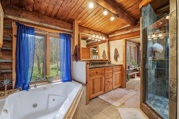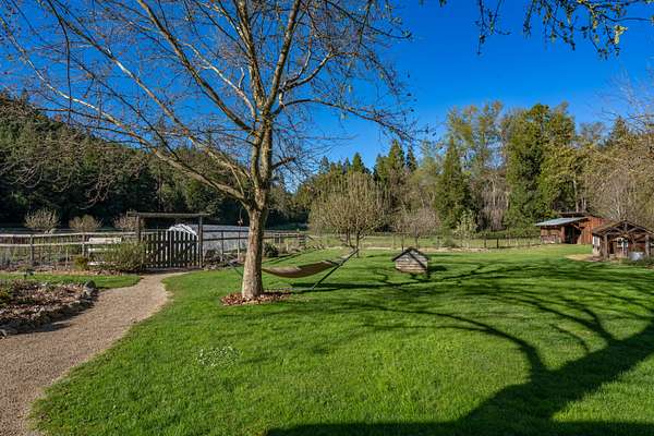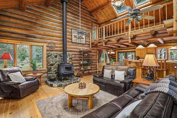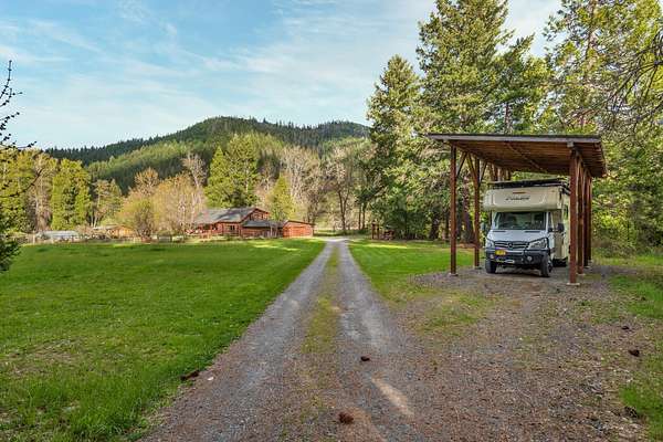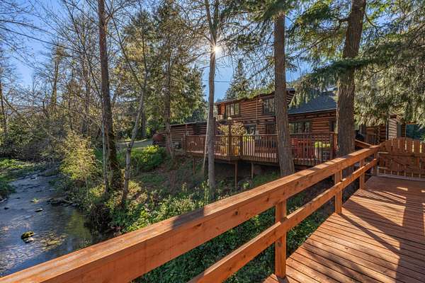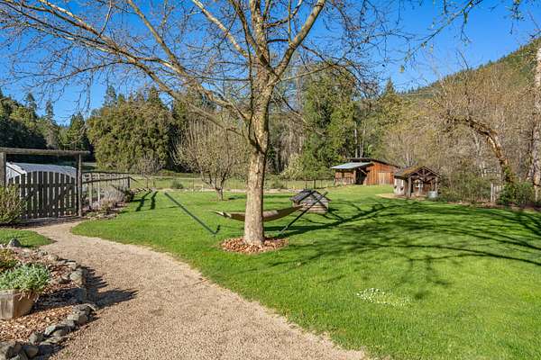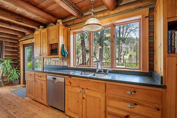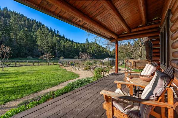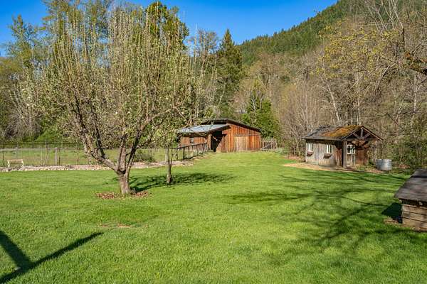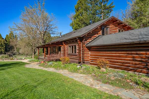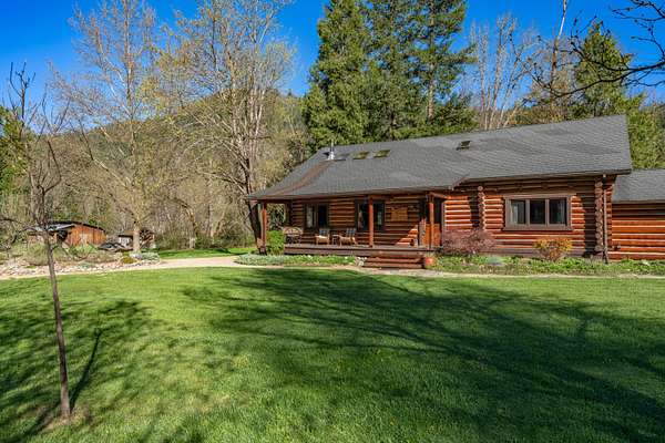 Welcome to Weather Bee Farms, a well cared for Northwest style log home and true working homestead set along Thompson Creek in the Applegate Valley. This 9.74 acre property offers privacy, usable land, water rights, and a peaceful creekfront setting just steps from the home. The residence blends timeless rustic character with comfortable living, featuring classic log construction, warm wood finishes, an inviting open concept layout, and a spacious kitchen with quality finishes that flows naturally into the main living and dining areas. Outside, the property is thoughtfully arranged for a true homestead lifestyle with established gardens, mature orchard plantings, usable pasture, a barn, and other practical outbuildings already in place. Ideally located between Grants Pass and Jacksonville, with nearby access to public lands, and the Applegate Valley wine trail, the property offers a rare opportunity to enjoy a slower pace, rural freedom, and a strong connection to the outdoors.