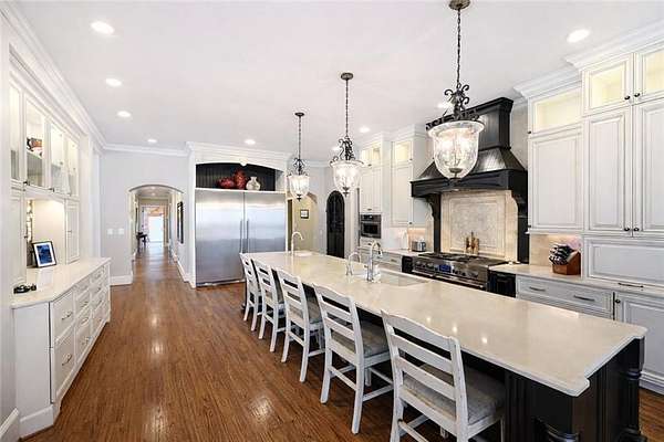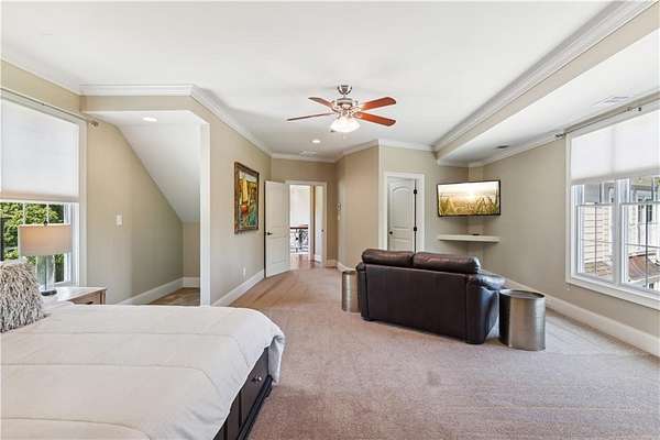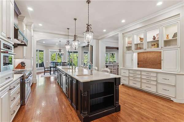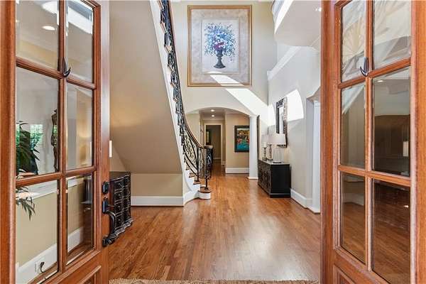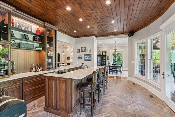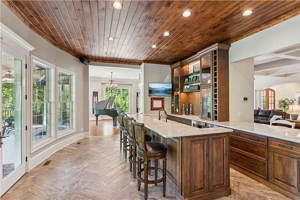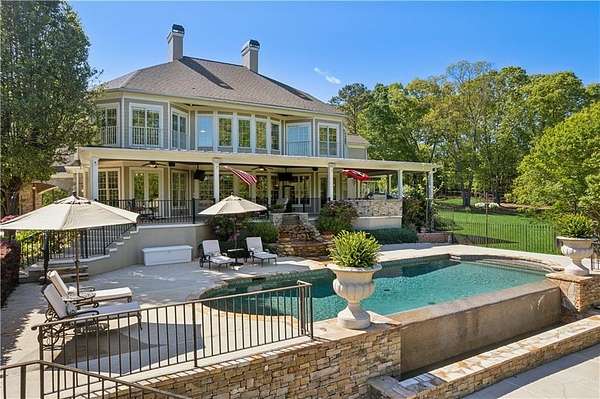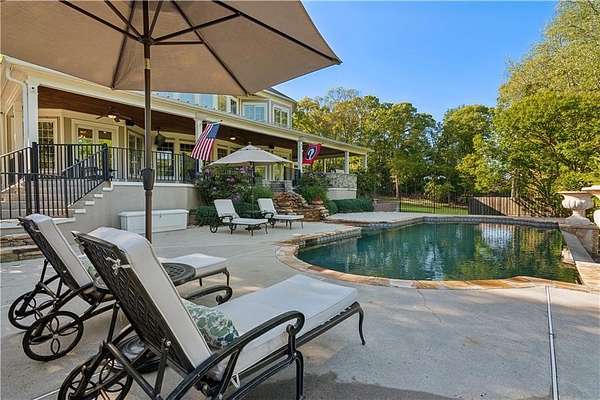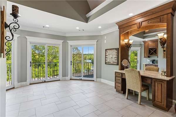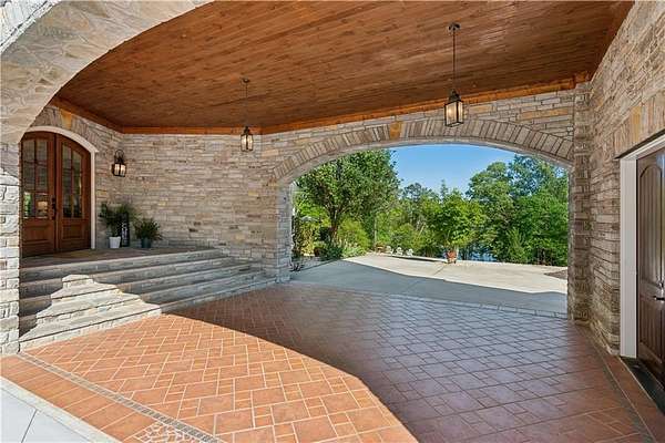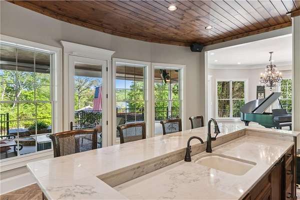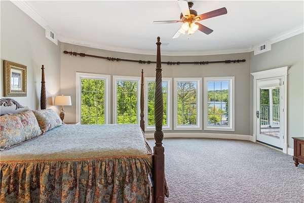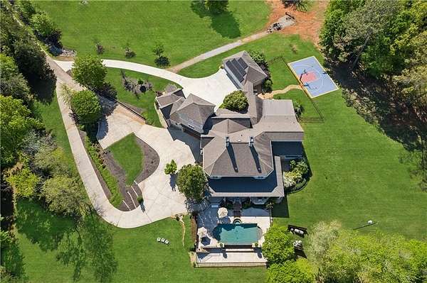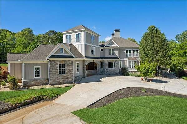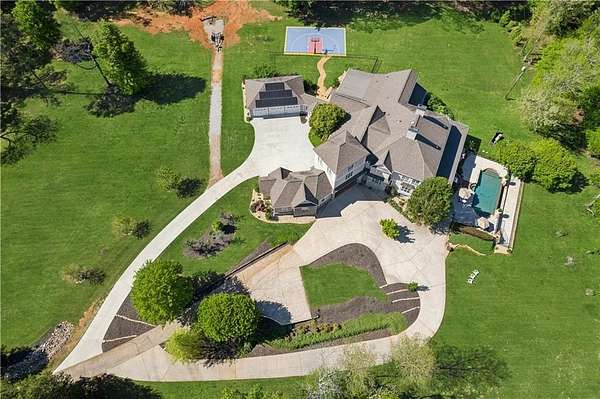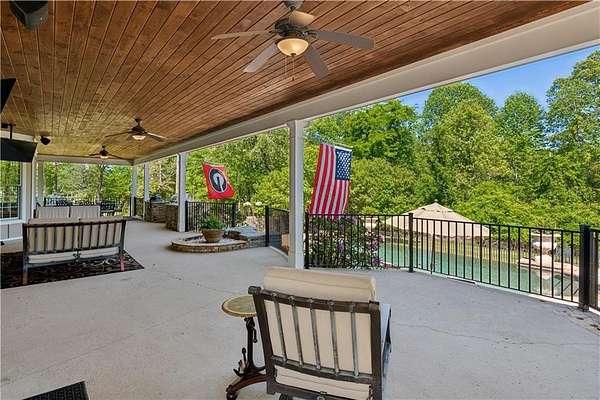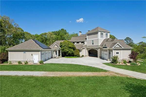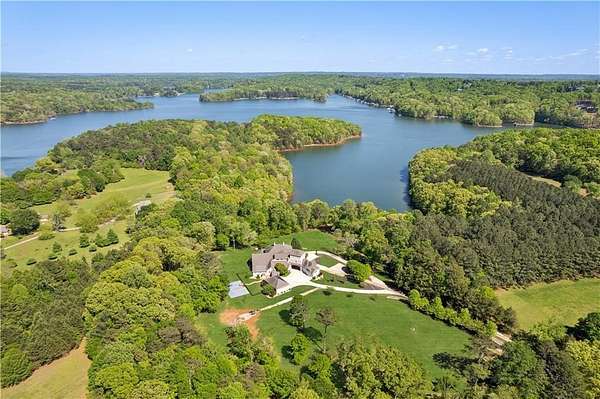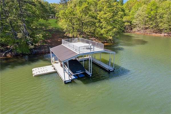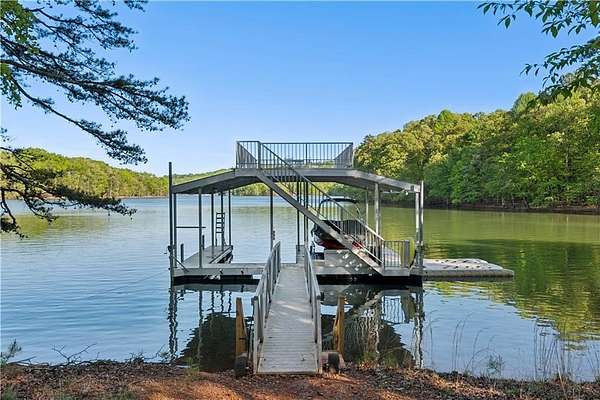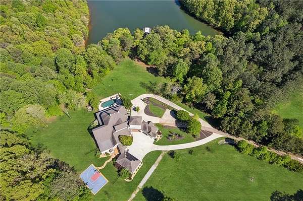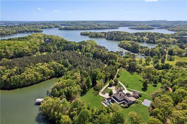 Enter a realm of unparalleled luxury and privacy at this extraordinary 6.5-acre lakefront estate on Lake Lanier, where sweeping water views, refined craftsmanship, and resort-style amenities converge. Approached through a private electric wrought-iron gate, this remarkable property immediately sets the tone for a lifestyle defined by elegance and tranquility. Expansive, pasture-like grounds offer rare privacy and space-ideal for equestrian pursuits or simply enjoying nature-while newly constructed steps lead to a top-tier 32' x 32' double-slip dock, the only private dock in the cove. Complete with a party deck, electric hydro hoist, and two jet ski ports, this waterfront haven delivers the ultimate boating and lake lifestyle experience. Outdoor living is elevated to an art form with a covered veranda overlooking the infinity pool and panoramic lake views-perfect for entertaining. Enjoy a built-in propane grill, separate smoker, dual TVs, and outdoor speakers, creating a seamless indoor-outdoor experience for hosting family and friends. Whether relaxing poolside or savoring peaceful mornings surrounded by wildlife, this estate promises unmatched serenity and beauty. Beyond the immaculate landscaping, a versatile sport court awaits-ideal for basketball or pickle-ball, or easily adaptable as a helipad. A grand porte-cochere with a custom wood ceiling and exquisite tile flooring welcomes you to the impressive front entrance. Inside, the four-level residence exudes timeless sophistication and was meticulously renovated in 2015 to incorporate modern luxury and technology. Features include smart-home automation, energy-efficient solar panels, reverse osmosis and whole-house filtration systems, and an audio system throughout. The king-sized great room showcases coffered ceilings and custom built-ins, creating a stunning setting for gatherings. The chef's kitchen is equally impressive, featuring a brand-new 6' side by side Thermador refrigerator & freezer, oversized island, marble countertops, premium appliances, coffee bar, and butler's pantry. Flowing effortlessly from the kitchen is a richly appointed bar with wood-paneled ceilings, an 80-lb-per-day ice maker, and its own dishwasher-designed for effortless entertaining. A formal dining room completes the main entertaining spaces. The main level offers a second master bedroom on the main, along with two spacious ensuite bedrooms with new hardwood floors, two of which rival primary suites in size and comfort. The second level is dedicated to the owner's retreat, a true sanctuary featuring a sitting room with a two-sided gas fireplace, private workout room (equipment conveys), spa-inspired bath with soaking tub and steam shower, wine bar, private laundry area and an office. An additional ensuite bedroom on this level offers stunning lake views. The third level provides a spectacular bonus room with panoramic lake vistas-perfect as a bunk room, office, or home theater. The lower level features a recreation and media room with abundant space for leisure and entertainment. A 5-car oversized garage offers exceptional storage for a car collection, workshop, or potential guesthouse conversion. This estate is more than a home-it's a legacy property where unforgettable memories are made in one of the most magical settings on Lake Lanier. With its exceptional layout and amenities, it also presents an outstanding opportunity as a luxury Airbnb or short-term rental, offering guests a truly one-of-a-kind lakefront experience.