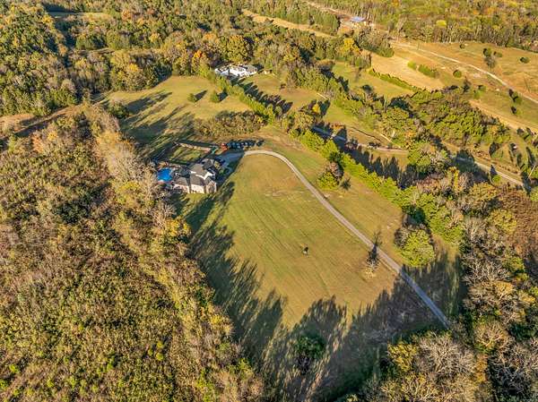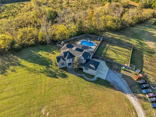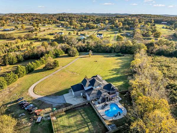 Stunning and secluded all-brick home on over 17 acres with several cleared areas and beautiful views! This private retreat features castle-style front doors, gorgeous wood floors throughout, and exceptional craftsmanship. The spacious eat-in kitchen includes an AGA oven with 6 burners and 4 separate ovens, and opens to a huge dining room--perfect for entertaining. Main level offers 2 bedrooms and an office; upstairs you'll find 3-4 additional bedrooms and a game room. Enjoy outdoor living with a full kitchen, outdoor bathroom, and inground pool with a new liner (2022) and pump. Recent updates include a new roof (2025) and HVAC (2023). Extras include a large laundry room, abundant storage, security system, air-conditioned garage, and whole-house filtration system. Tractor and attachments available for sale (original cost $120K). Conveniently located near Cedars of Lebanon State Park, just 10 minutes to dining and shopping, and 30 minutes to the Nashville airport. Seller offering buyer credit of 10K to pick and paint their own colors. 1% lender credit with use of preferred lender. See attached drone video