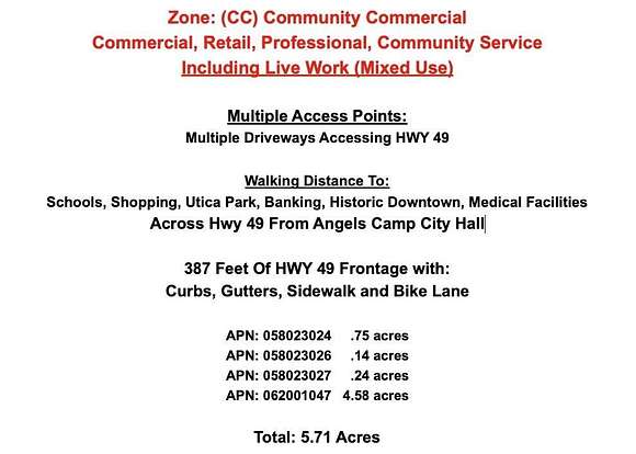 Your Development Belongs in Angels Camp! Dreaming of building in a community that wants your vision to thrive? Look no further! These prime downtown parcels, zoned Community Commercial (CC)offer unparalleled flexibility for Commercial, Retail, Professional, and Community Service ventures, including coveted Live-Work (Mixed Use) possibilities. Nestled in the heart of the new Angels Camp Commercial District, just steps from the charm of Historic Downtown and the vibrant Utica Park, this listing is a developer's dream. With four separate parcels totaling 5.71 acres and nearly 300 feet of Highway 49 frontage, complete with multiple driveways, the opportunity for accessibility and visibility is unmatched. Your project will be the jewel of the town, offering breathtaking views to the Northeast. Imagine tenants or patrons enjoying easy accessan effortless walk to nearby residential neighborhoods, Mark Twain Elementary, and Bret Harte High School. Exciting updates? The nearby Utica Park recently received $3+ million in grants for upgrades to attract even more tourists to downtown! Enhanced sidewalks, bike lanes, and pedestrian pathways connect your development seamlessly to the area's vibrant community hubs. Angels Camp is on the rise. This development and business-friendly city is growing fast and ready to welcome your vision with open arms. Don't just buildbe part of a thriving legacy. Your project starts here!