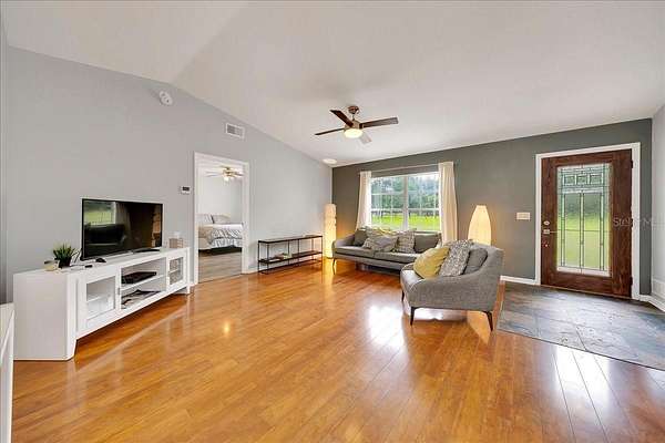 This charming 6-acre farm in NW Marion County is just 10 minutes from the World Equestrian Center and 2.2 miles from HITS. The cozy 3-bedroom, 2-bath block home features a new roof (2019) and a welcoming layout that separates the bedrooms for privacy. The kitchen boasts stainless steel appliances and a deep basin sink, while the dining room opens through French doors to a screened lanai and a spacious 27 x 14 patio. Outside, you'll find three paddocks with safe fencing and a loafing shed for two horses that can also be converted into stalls. Best of all, there's no HOA!