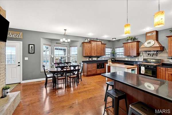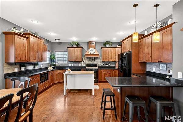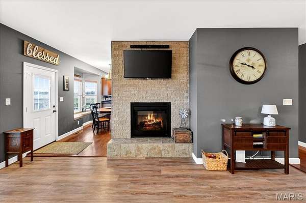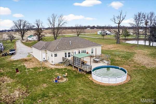 Spacious country living on 3.22 acres! This well-maintained ranch features an open floor plan with 9-ft ceilings and abundant natural light. The inviting living area includes a double-sided fireplace and flows into a large kitchen with quartz countertops, soft-close cabinetry, ample counter space, and an eat-in dining area. Additional highlights include central vacuum and an efficient geothermal HVAC system. The primary suite offers a private ensuite bath, while additional bedrooms provide flexibility for guests or home office use. Main-floor laundry adds convenience, and Bluetooth speakers in the kitchen and primary shower offer a modern touch. Enjoy outdoor living on the expansive deck with an above-ground pool and custom tiki bar--ideal for entertaining. The home features an oversized attached garage with built-in workbench and shelving, plus an oversized detached garage/workshop. The full basement offers extensive storage and future potential. Located just 3 miles from schools, shopping, and dining.