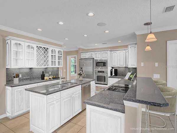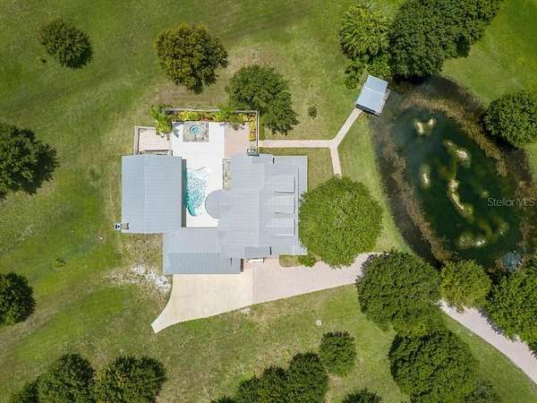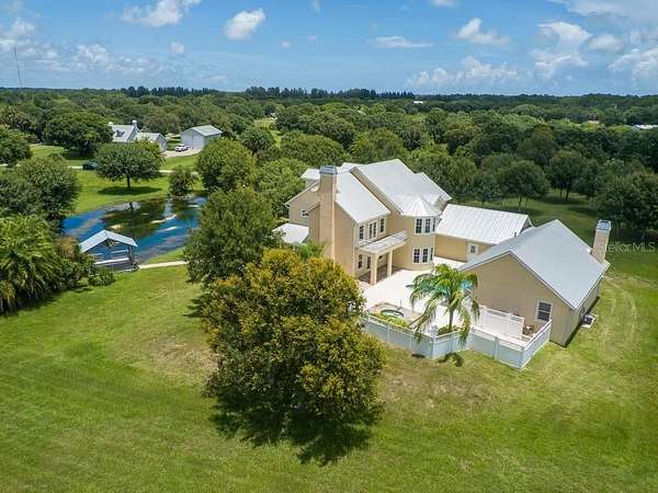 One or more photo(s) has been virtually staged. Welcome to this exquisite private, one of a kind custom 5-bedroom, 4.5-bathroom home nestled on 5 acres of pristine land in one of the most desirable neighborhoods in town. This stunning property is a true masterpiece, boasting luxurious finishes, exceptional craftsmanship, and breathtaking views. The main house features an open and spacious floor plan that seamlessly integrates the indoor and outdoor living spaces. The family room features trey ceilings, a cozy fireplace, French doors onto the porch and pool deck and large windows that flood the space with natural light. The formal dining and living rooms feature pocket doors to separate the formal areas. Both have trey ceilings and the dining room features wainscoting. Both formal rooms open onto the wraparound front porch. The gourmet kitchen is a chef's dream, with custom cabinetry, and a large island and bar, perfect for entertaining guests. The informal nook adjoins the kitchen and is perfect for family and friends to gather. The nook has a rounded bank of windows overlooking the pool area. There are stairs from the entry or kitchen to the second level. The second level houses the bedrooms. The primary suite is a true retreat, complete with fireplace, a luxurious spa-like bathroom, walk-in closet, and private balcony overlooking the stunning grounds. Three additional bedrooms, each with their own unique features and charm, offer ample space for family and guests. One of bedrooms has an ensuite bath, and is perfect for the young lady of the house. The other two bedrooms feature a jack and jill bath, with separate tub and toilet. Follow another set of stairs to the third level of the home and find a large flex space. There is room for office, den, playroom and three alcoves in the window dormers, perfect for exercise equipment or art studio. This level is only limited by your imagination. There is also a large walled off storage closet tucked to one end of the third level. The separate guest house is a true gem, offering a large great room with fireplace, an additional bedroom, bathroom, and a full kitchen. Perfect for hosting guests, in-laws, or as a potential rental income opportunity. The expansive outdoor space is an entertainer's dream, featuring a sparkling pool, spa, covered porches and expansive deck area. The landscaped grounds provide the perfect backdrop for relaxing or entertaining, with stunning views of the oak canopied acreage and front pond. Additional features of this home include a 3-car garage, a laundry room, and ample storage space throughout. With its unparalleled location, luxurious amenities, and exceptional craftsmanship, this home truly offers the best of both worlds - privacy and luxury living in a serene natural setting. Don't miss out on the opportunity to make this stunning property your own.