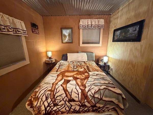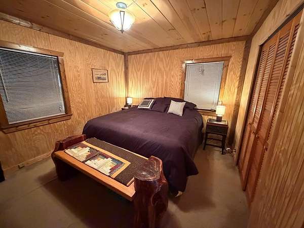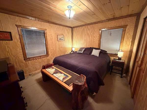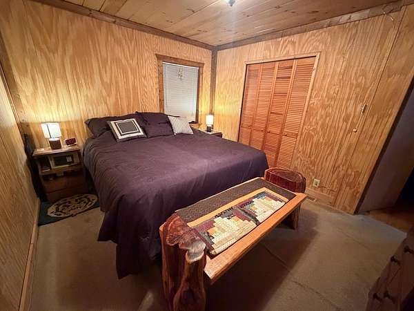 Breathe in the Mountain Air & Escape to a Simpler Way of Life with this Rustic, Wood-Sided 2-story Cabin/Cottage tucked away on 5+ Private Acres with a Wide Seasonal Mountain View & 334' of Stream Frontage (w/ Small Ponds). About 4.5 miles miles south of DOWNTOWN Blue Ridge & only 1.5 miles off the Hwy 515 Corridor... Accessed by County-Maintained Paved Roads. A new 2023 Metal Roof tops the Cabin while a full FOUR -Sided Wrap-Around Porch (One Covered at Entry) invites Morning Coffee or Quiet Evenings Overlooking your Private Nature Preserve in this Civilized Location. Double "French Entry Doors" open to a warm, ALL-Wood Interior Centered around a Striking BRICK Double-Chimney Flue and Stylish Metal Ceilings that enhance the Cabin's Rustic Character. Central HVAC provides Year-Round Comfort. The Main Level includes an 11x12 bedroom with a large closet, Full Bath with a one-piece tub/shower unit, stackable laundry hookup Plus a Large Pantry Closet. The Terrace level offers a finished 9x12 Bedroom ideal for Guests, plus 668 sq ft of unfinished Basement Space for future expansion. Quality features include vinyl soffit & fascia, insulated vinyl windows, a new hot water heater (2023) & a Whole-House Generator installed in 2020. Multiple Outbuildings include an 18x20 Metal Workshop (Garage), a 8x12 Greenhouse (2022) with Fenced-In Raised Garden Beds & a 10x10 Metal Equipment Shed (2002). There is an improved Firepit Area Under the Stars and an ATV Trail to explore. Enjoy the level area down by the Stream (seller currently parking equipment trailers) that features several flowing "Springs" that feed the Stream. A Gated Shared Driveway leads to a Private Homesite Above the Stream--offering Peace, Privacy & the ultimate Mountain Cabin Setting... tucked sweetly away in a very Convenient Location only 4 miles from the City Limits of Blue Ridge. Area features ETC Fiber Optic Internet. Unrestricted Acreage ..so bring the Chickens or build another Cabin in this fabulous location.