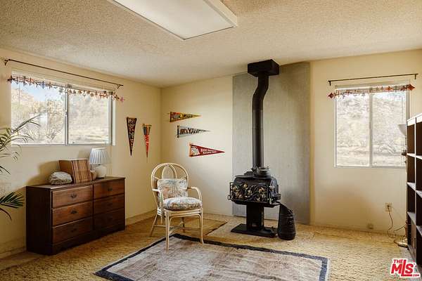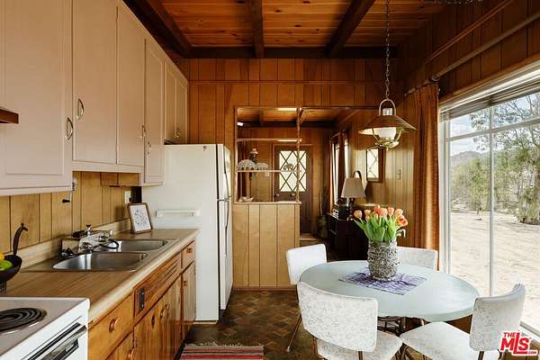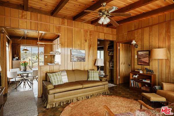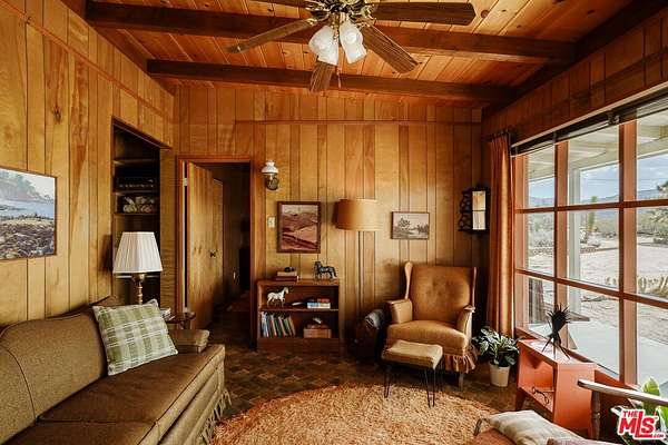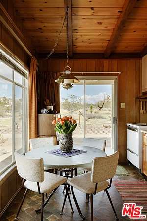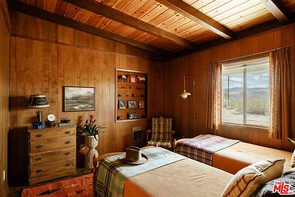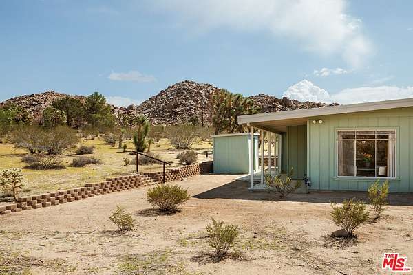 Time to slow down and unwind at Wagon Wheel Hideaway - a 1955 midcentury cabin set on five acres of pristine desert, just five minutes from the entrance of Joshua Tree National Park. Backed against the boulders of Monument Manor, this nostalgic retreat offers a rare opportunity to own a piece of desert history with more than enough space to write a new chapter. Architectural plans have been drawn by the renowned firm Oller & Pejic for a structure that engages in an evocative conversation with the landscape. Cherished by the same family for over half a century, this much-loved vacation home has been a gathering place for holidays and quality time within its cozy two-bedroom, one-bathroom footprint. Attached to the house, a spacious two-car garage includes a storage and bonus room, ideal for a studio or creative workshop. Outside, mature Joshua trees anchor sweeping desert vistas visible from every room. Add a pool, park your Airstream, open up a bygone-era Airbnb, or simply sit back and watch the sky turn orange and violet each evening from the porch- the possibilities are endless. This is the one - a prestigious Monument Manor location, BLM hiking trails up the road, stargazing, close proximity to the buzz of downtown Joshua Tree, and the tranquility of nature right at your doorstep.
