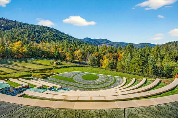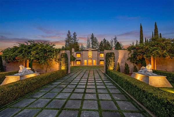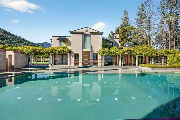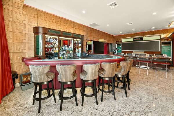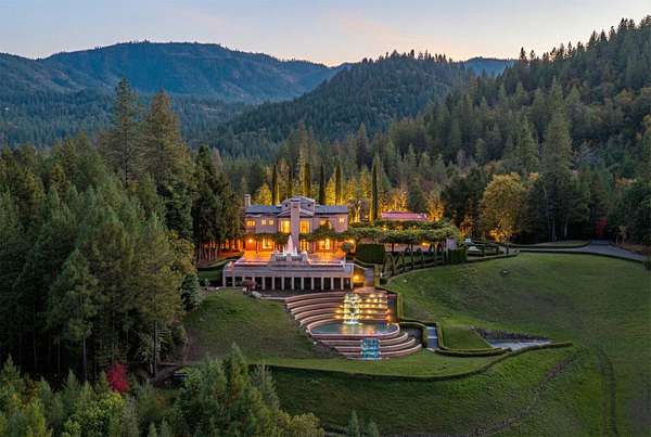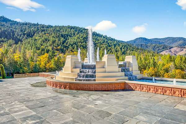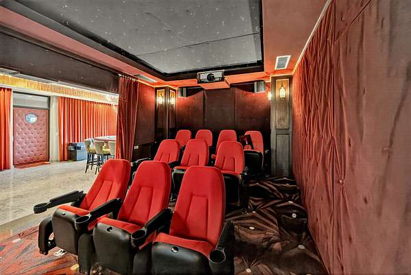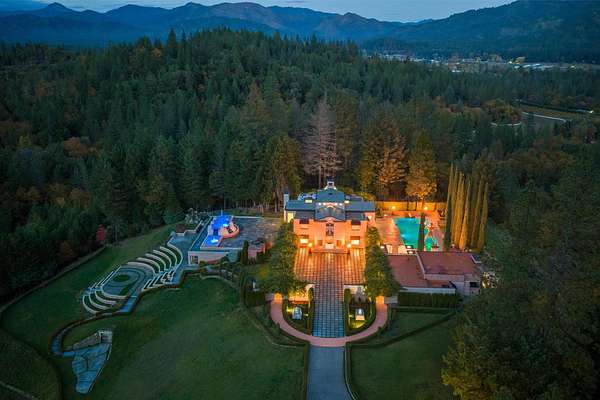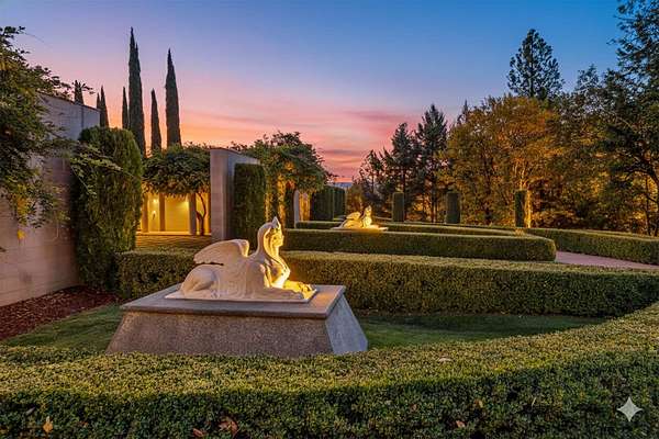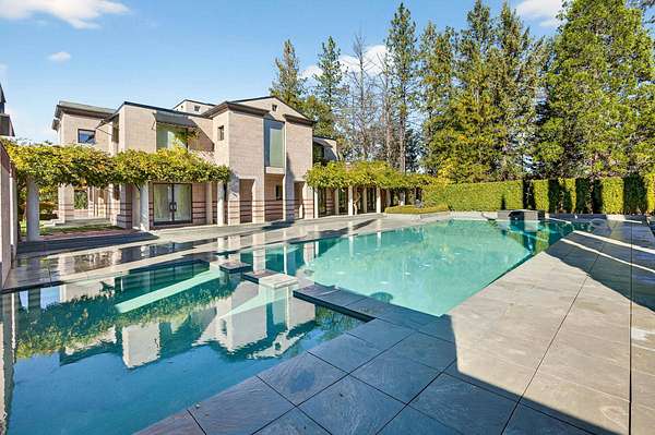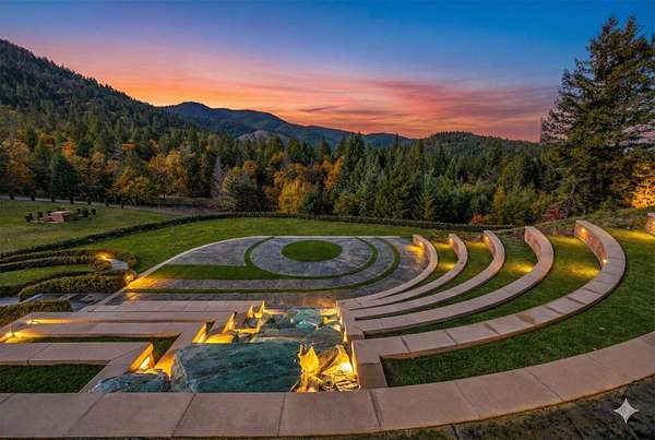 The grounds are equally compelling. A multi-tiered amphitheater with cascading water features creates a dramatic setting for events, while terraced entertaining areas offer both scale and privacy. A wisteria-draped pergola leads to an Olympic-sized pool, complete with a hidden speakeasy bar and private theater, blending elegance with unexpected character.